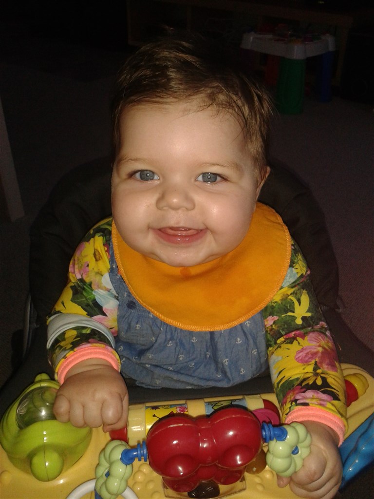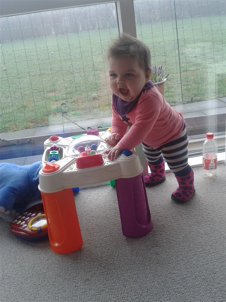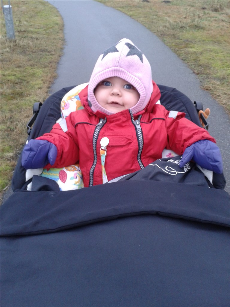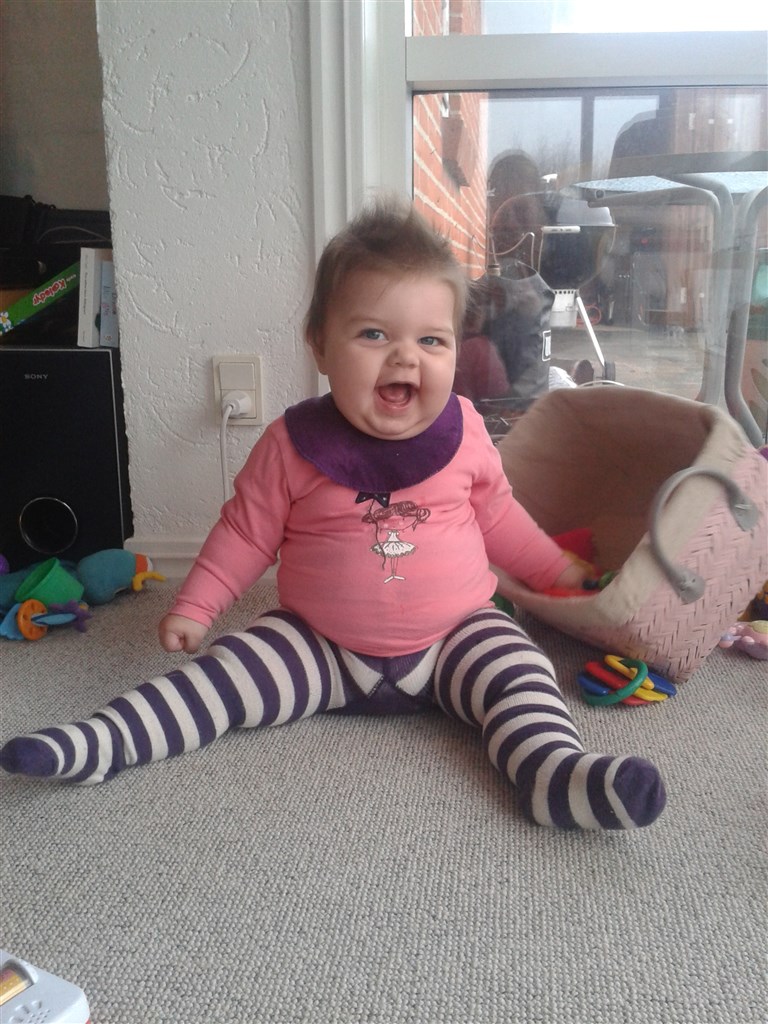 Hendes dagplejemor fortæller at hun ALTID er glad, og hun får gerne de andre børn med på hvad hun nu end har gang i (forestil jer tre børn og en voksen på gåtur, hvor alle højlydt laver prutte-lyde med munden