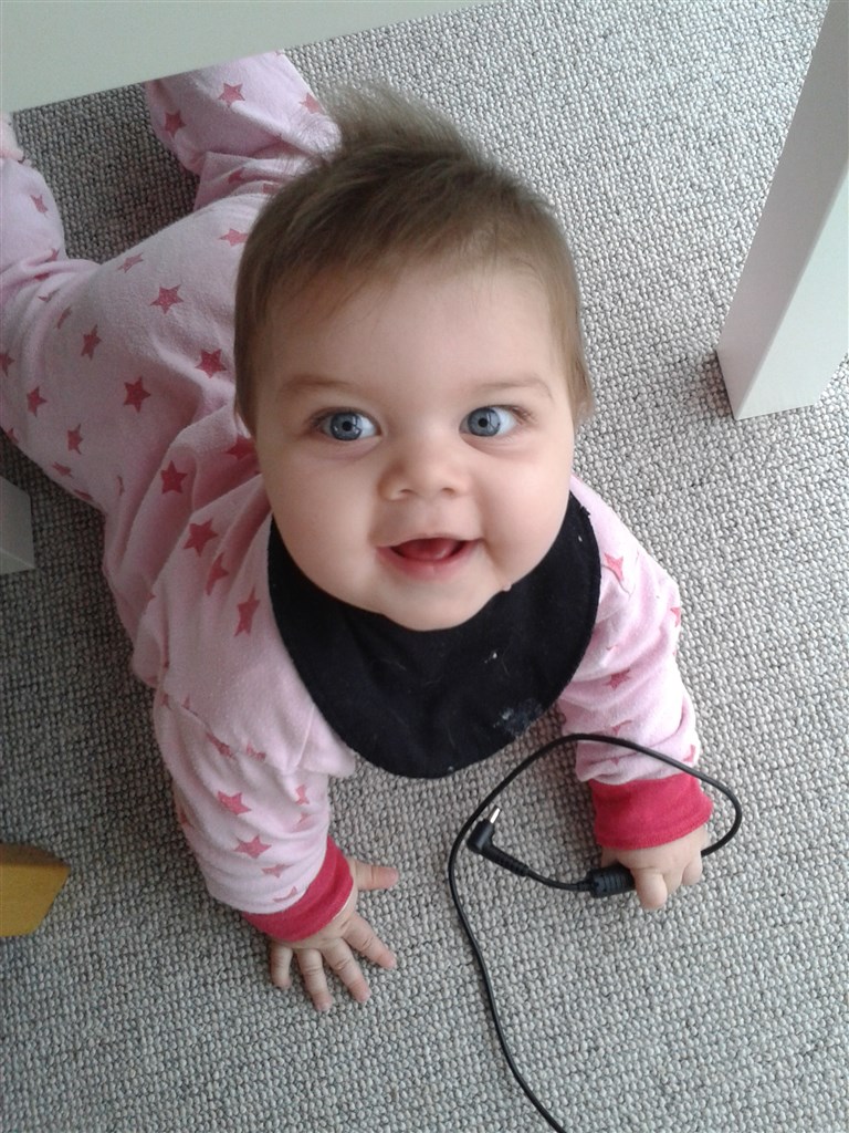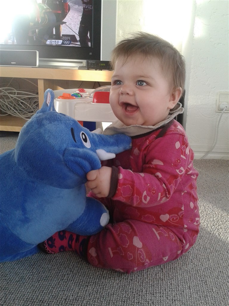 Hun har en interesse i lyde og musik - reagerer på alt hvad hun hører, og jeg tror faktisk også at hun er begyndt at synge (altså det er nu mest skrige-lyde i forskellige niveauer - men det lyder som hendes udgave af sang
