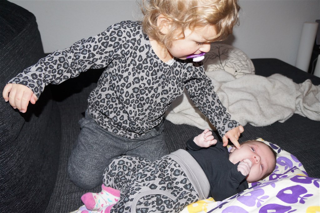 Storesøster Mila er stolt og vil gerne hjælpe med at give sut og flaske og ellers bare kysse, kramme og ae sin "nillesøster".