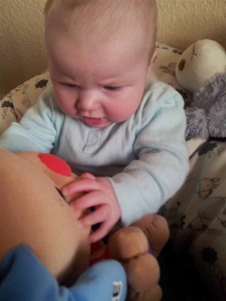ved 3½ mdr startede vi op på vælling til natten, i samråd med sp, han er en meget stor dreng som også har brug for lidt ekstra for at holde sig mæt. han blev målt og vejet i sidste uge og knægten måler nu 66 cm (ved fødsel 52) og med en kampvægt på 8,5 kg (ved fødsel 4350g)