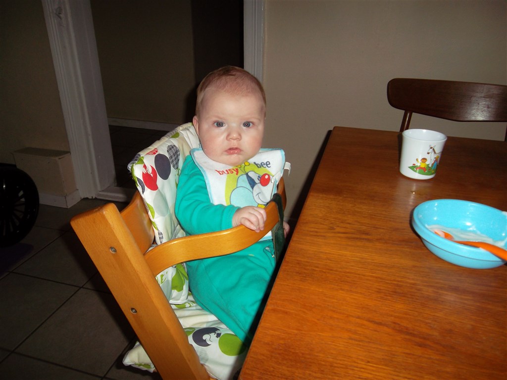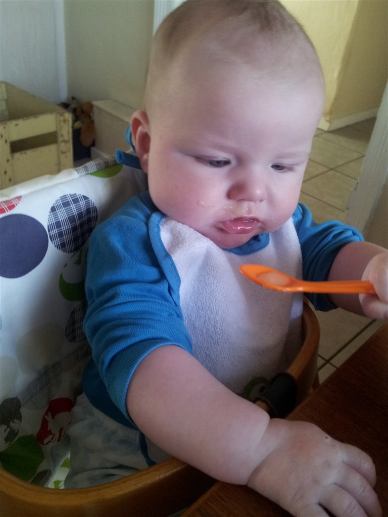 i sidste uge startede vi så også op på grød/mos til middag og det køre bare derud af, han har længe vist tegn på at han var klar, og har fulgt mig og martin meget nøje når vi indtog mad og drikkevarer. allerede efter 2 skefulde åbnede han selv munden og det bliver han ved med, så jeg sætter stadig grænsen for hvor meget han må få sådan at maven lige kan følge med.