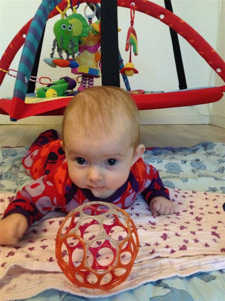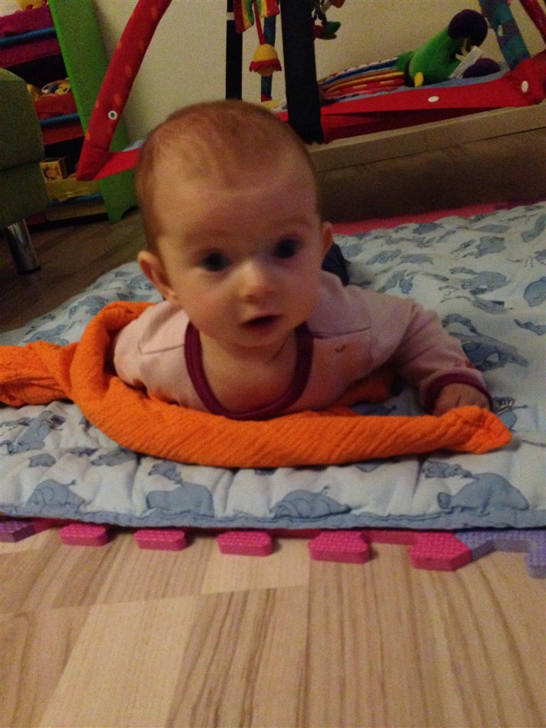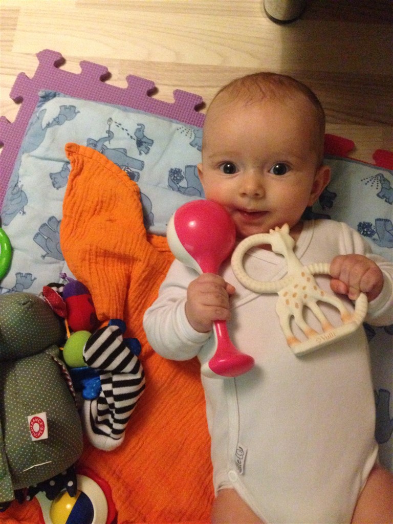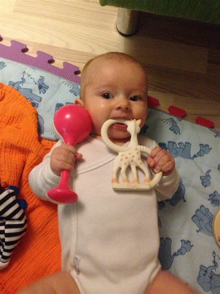 Hun er rigtig stærk og holder hovedet 100% selv nu. Det er kun når hun bliver en smule træt, at hun putter hovedet ind til vores bryst. Hun vil rigtig gerne stå på sine ben, og hoppe op og ned. Hun elsker at lege med sit legetøj nu, og det bliver godt og grundig undersøgt.