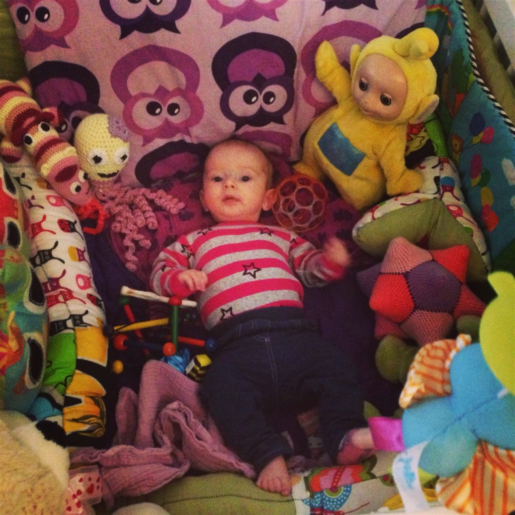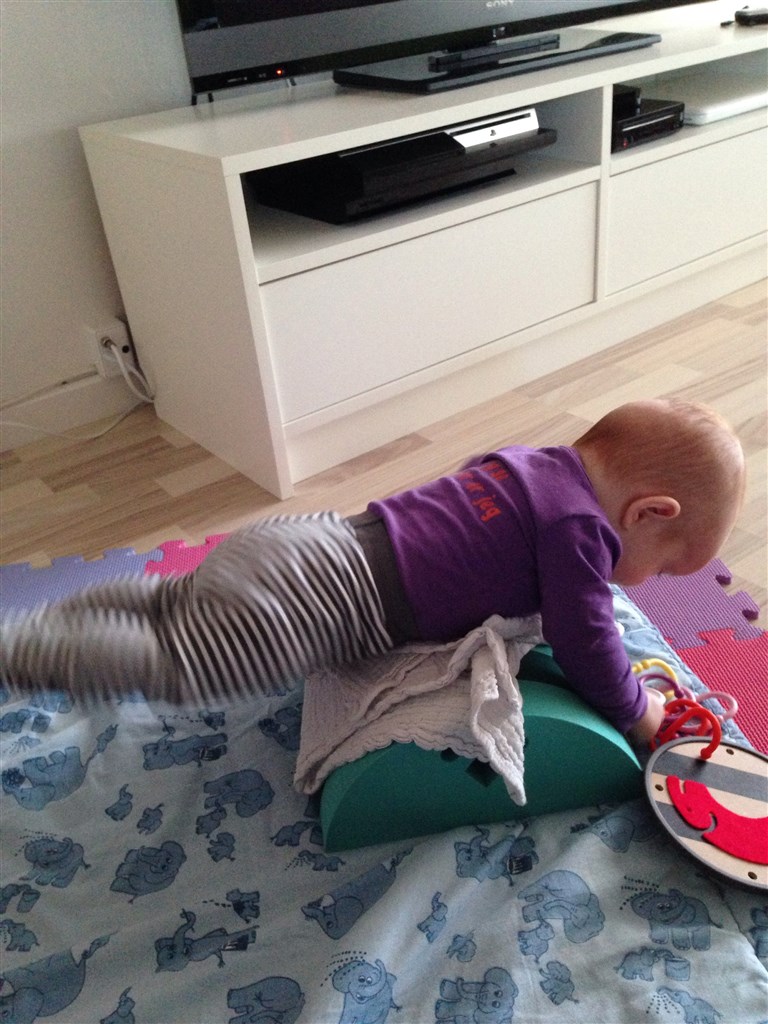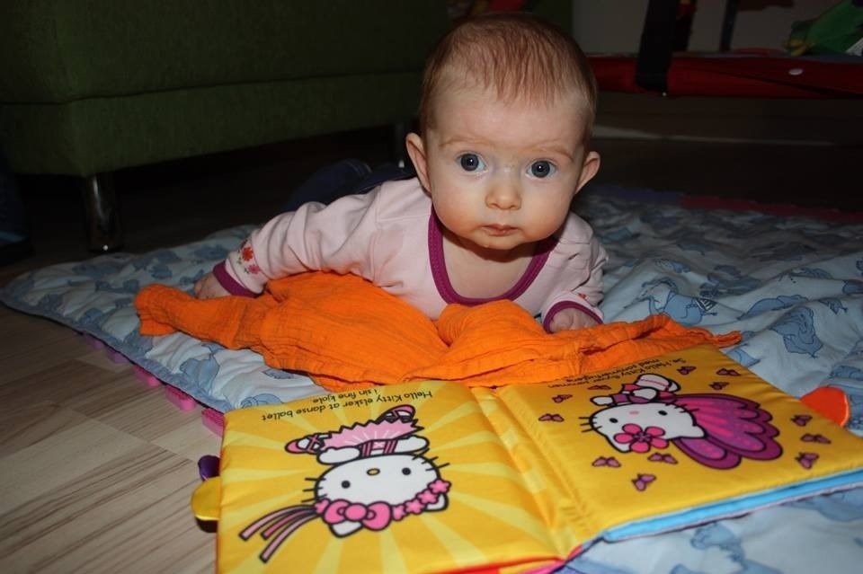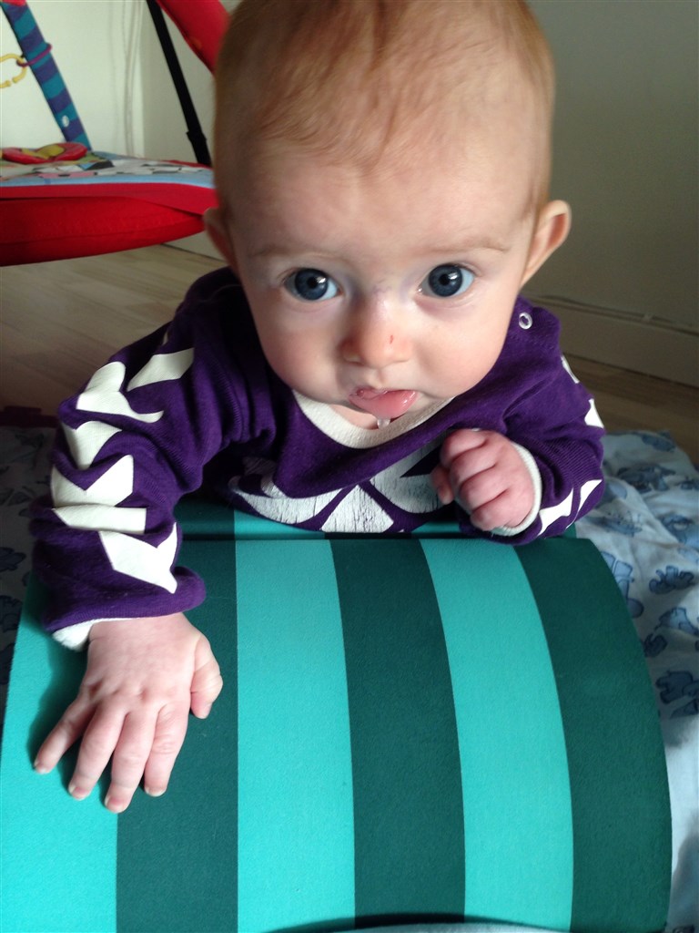 Hun er rigtig stærk og holder hovedet 100% selv nu. Det er kun når hun bliver en smule træt, at hun putter hovedet ind til vores bryst. Hun vil rigtig gerne stå på sine ben, og hoppe op og ned. Hun elsker at lege med sit legetøj nu, og det bliver godt og grundig undersøgt.
