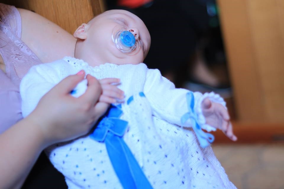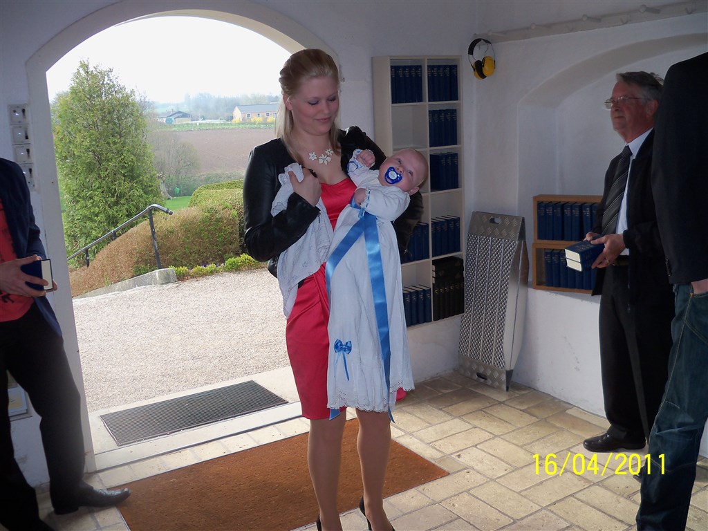 Desværre et lidt dårligt billede af kjolen, men her er min søn da han blev døbt i 2011. Min datter, som bliver født til maj skal døbes i samme kjole.