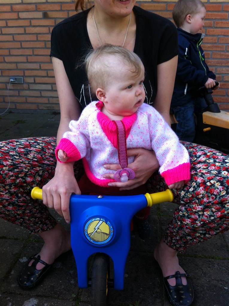 Hun er nu også begyndt at komme i kravle stilling og vugge frem og tilbage. Hun kan sidde selv men ikke sætte sig op endnu, og så er der 2 bisser mere på vej.