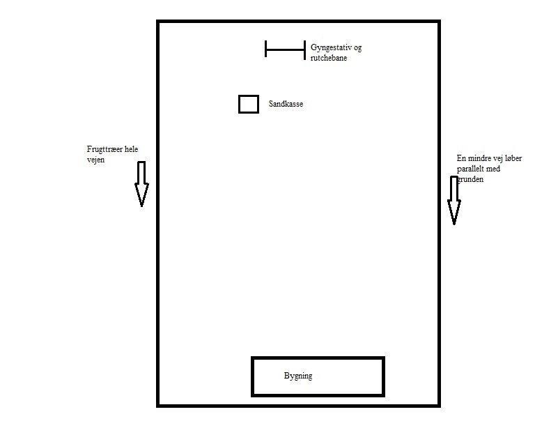 Forresten har vi planlagt at der skal bygges et legehus oppe i venstre hjørne. Desuden har vi en stor trampolin vi flytter rundt op midt i haven.