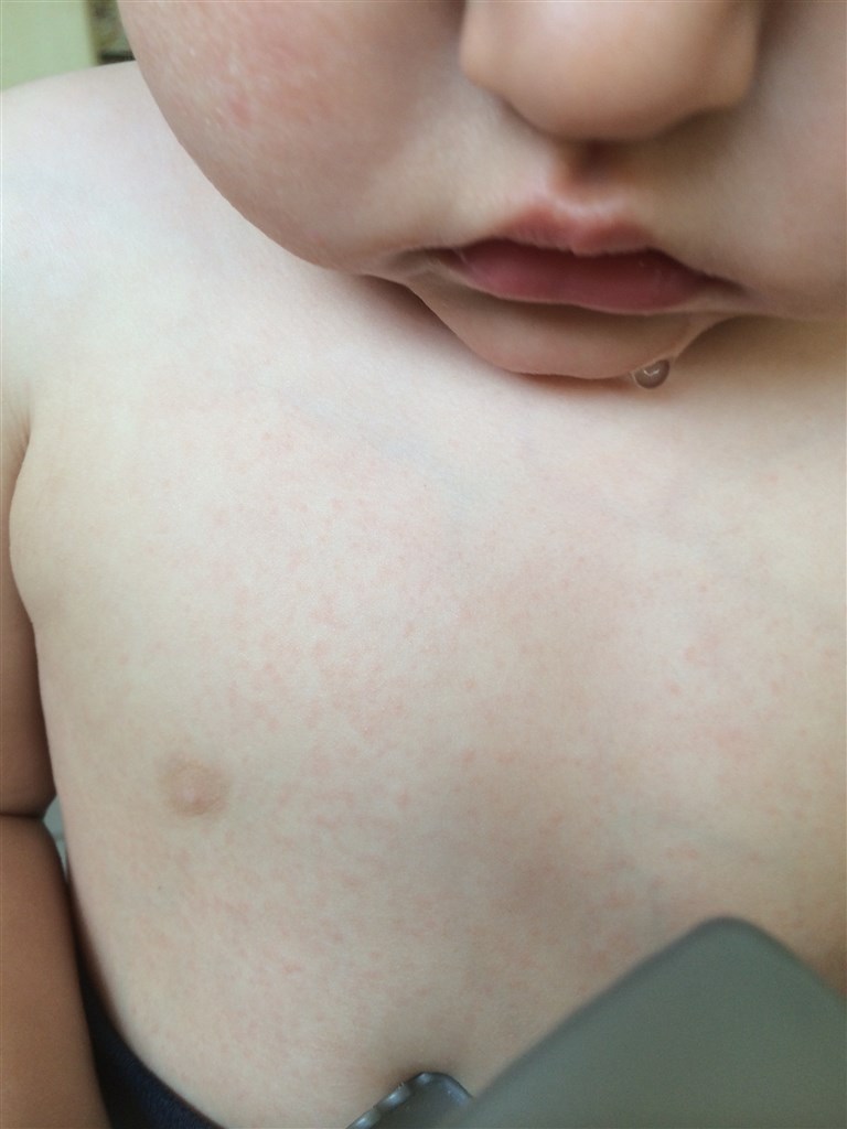 Han er ikke syg. Startede på kinder og nakke, troede det var eksem på kinder og varme knopper i nakken. Men der kommer mere til hver dag.