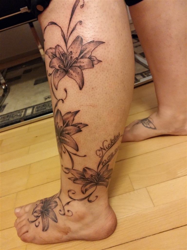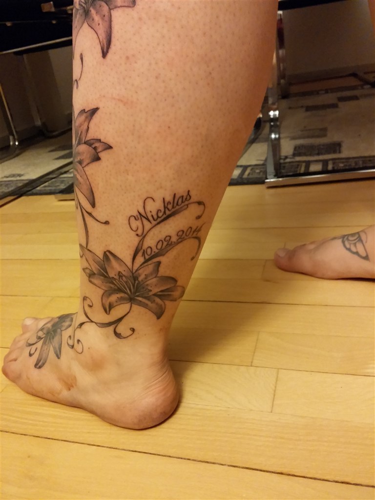 Men endelig fik jeg min tattoo med min fantastiske skønne søns navn og fødselsdato. Den har været ventet.. Og så ville manden min da lige forkæle mig så han gav mig lige en ekstra tattoo.. Jeg er virkelig så fantastisk glad for resultatet.. Men hold jeg har været under nålen i 3,5 timer og så var jeg også træt til sidst.. Men man må lide for skønheden