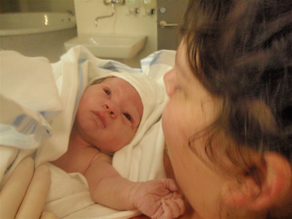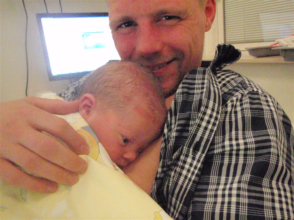 Jeg får ham hurtigt op på brystet, mens navlesnoren bliver klippet og derefter bliver han taget over og suget for slim og snask og de begynder at tjekke ham efter i sømmene. De beslutter at tage ham med op på neonatal, da de ville være sikker på at alt er i orden med hans lunger, jeg får lov til at ligge med Hjalte i armene mens lægerne forklarer mig hvad der skal foregå. Allan følger selvfølgelig med ham. Imens bliver jeg syet (3 små rifter) og efter 20 utrolig lange minutter træder Allan ind på fødestuen med Hjalte i sine arme - sikke en lettelse! Han var heldigvis helt sund og rask ! Inden længe sutter han ved brystet og den lykkelig familie-rus kan endelig begynde <3