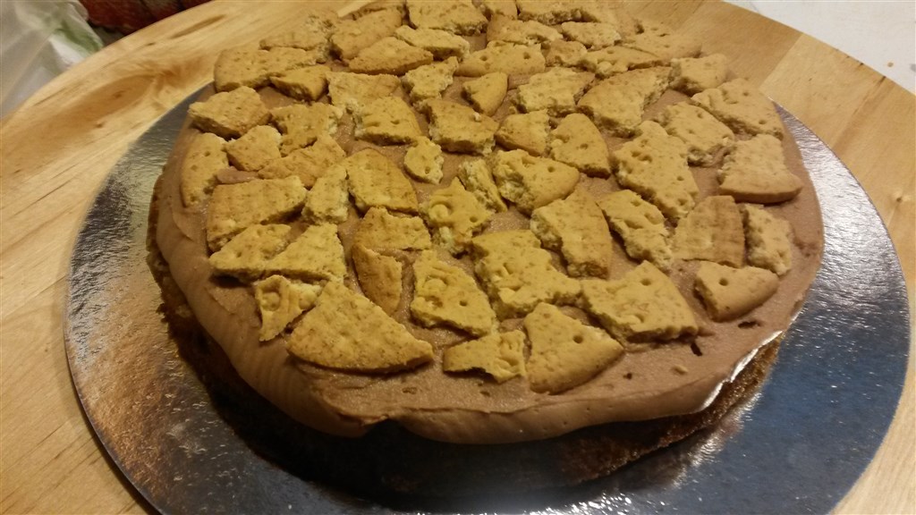 Det er banankage med lys chokoladecreme knuste Digestive beklædt med marcipan blandet med fondant.