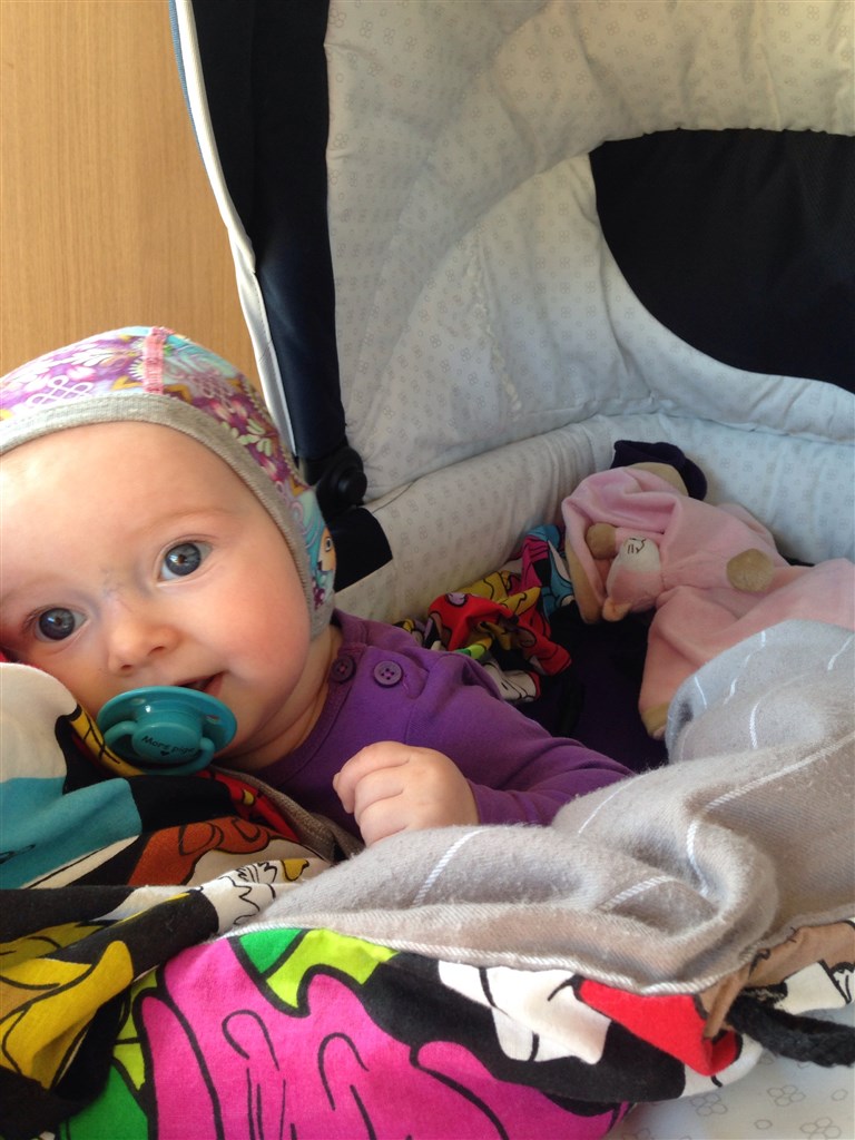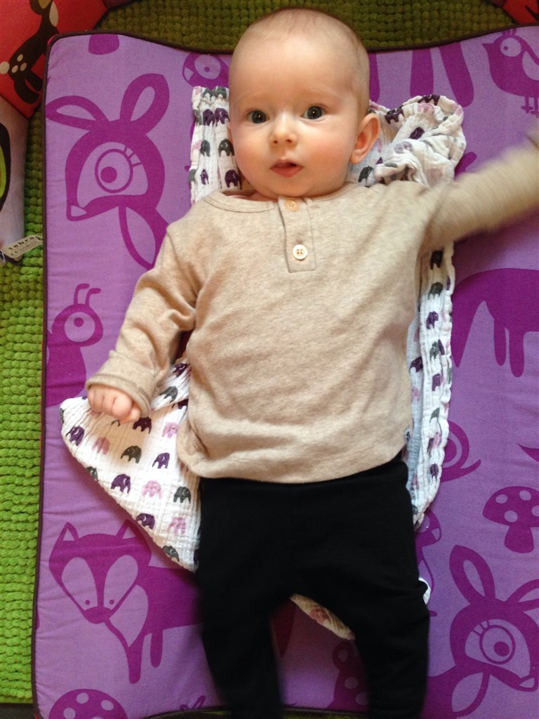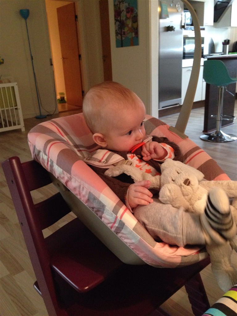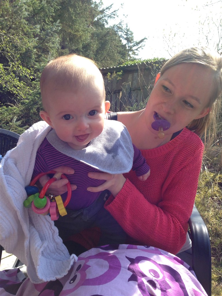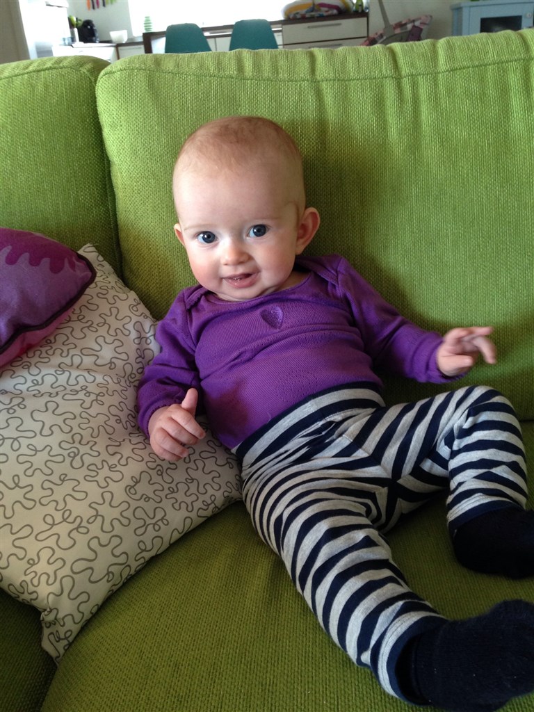 Alt går godt med hende. Vi startede på grød/mos en uge inden hun blev 5 måneder, og hun elsker alt mad. Hun er en dejlig smilende og lattermild pige. Humøret er næsten altid i top. Hun ruller rundt, både fra mave til ryg og ryg til mave. Hun sidder rimelig stabilt og kan selv sidde i sin højstol. Søvn er dog lidt en by i Rusland for hende, men hun er glad langt størstedelen af tiden, så det er ok