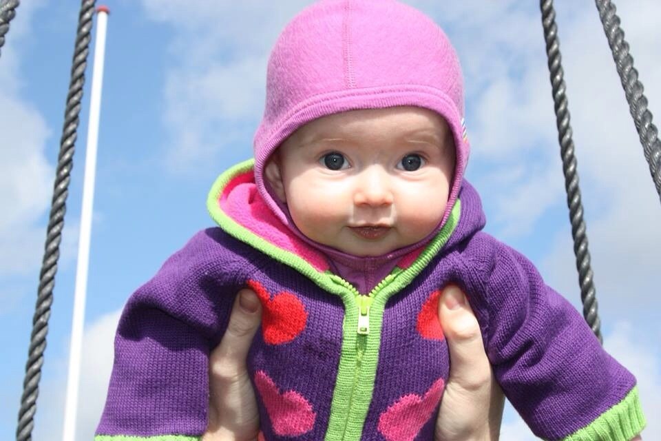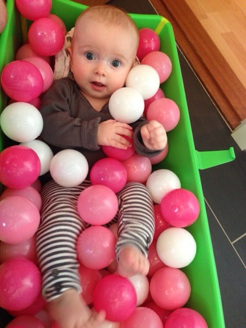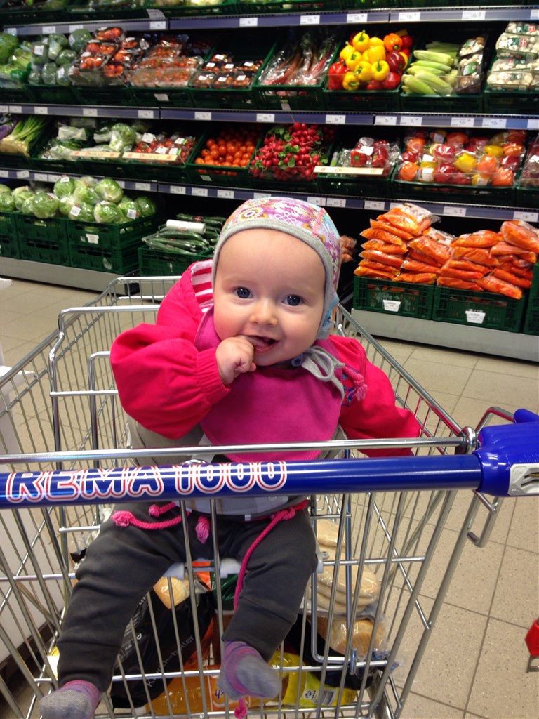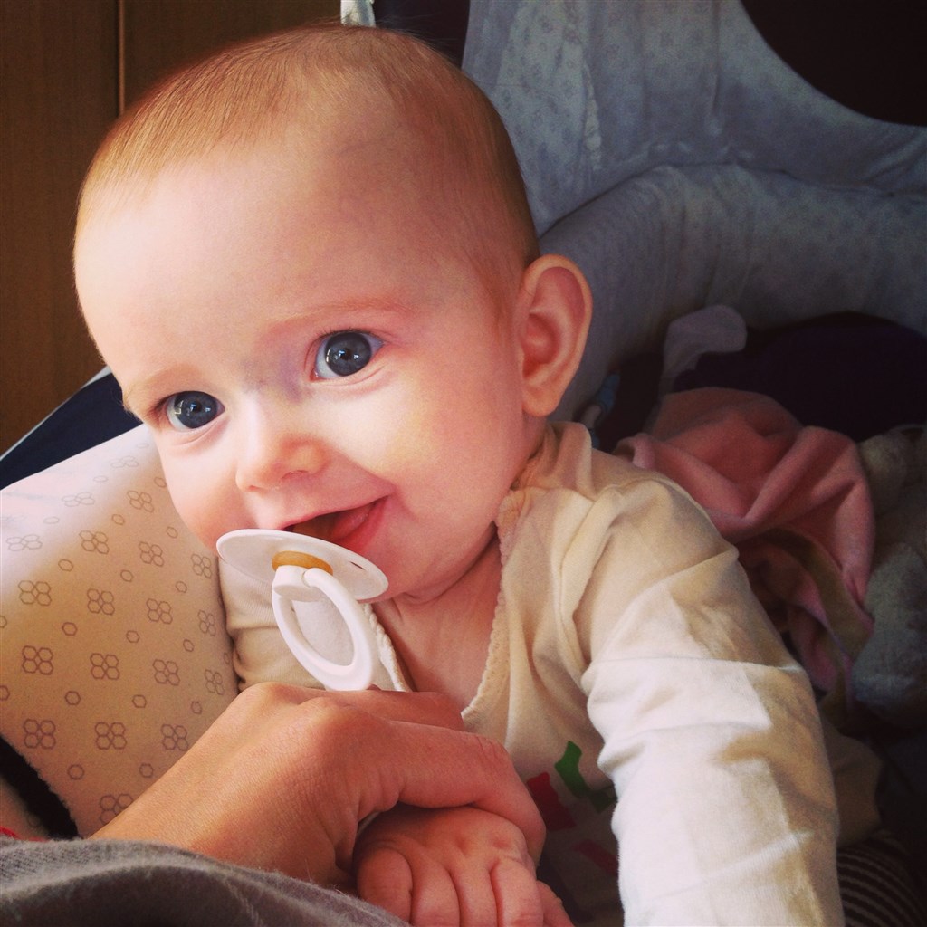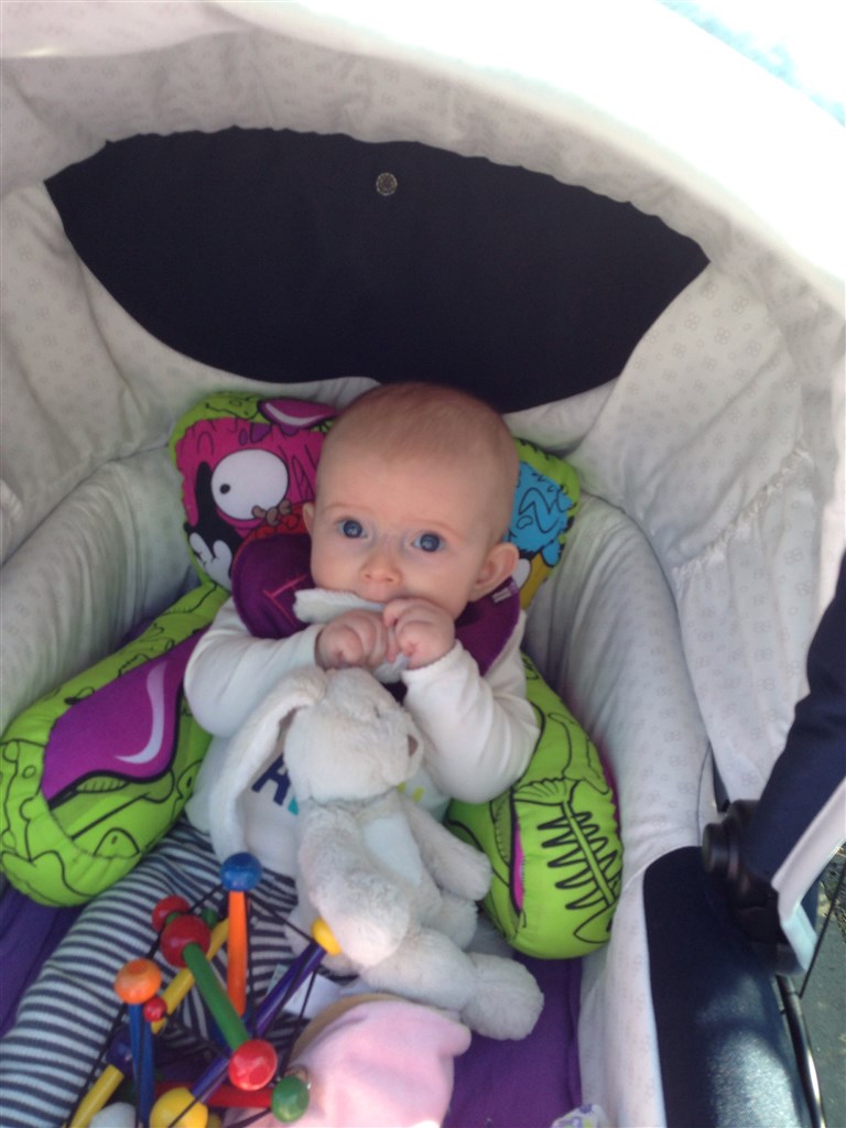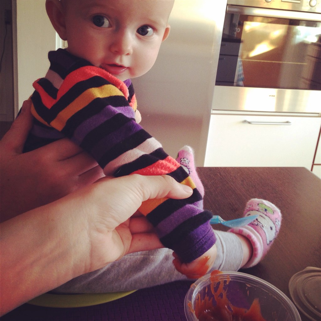 Alt går godt med hende. Vi startede på grød/mos en uge inden hun blev 5 måneder, og hun elsker alt mad. Hun er en dejlig smilende og lattermild pige. Humøret er næsten altid i top. Hun ruller rundt, både fra mave til ryg og ryg til mave. Hun sidder rimelig stabilt og kan selv sidde i sin højstol. Søvn er dog lidt en by i Rusland for hende, men hun er glad langt størstedelen af tiden, så det er ok