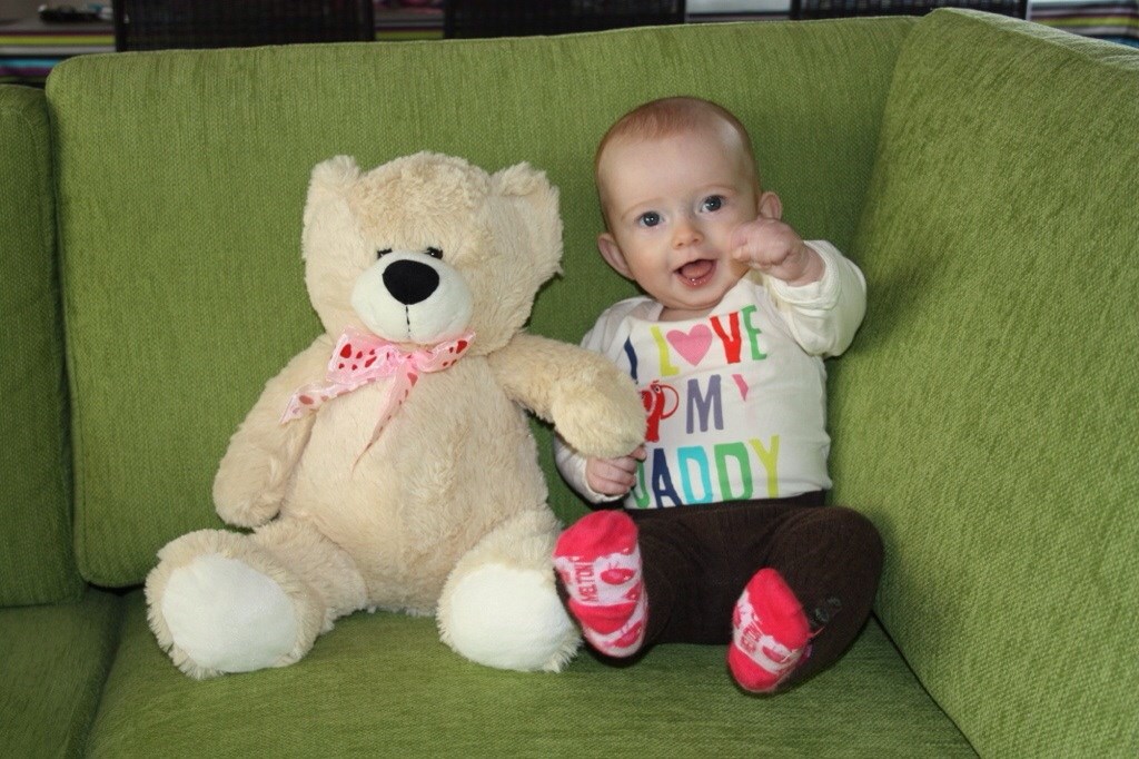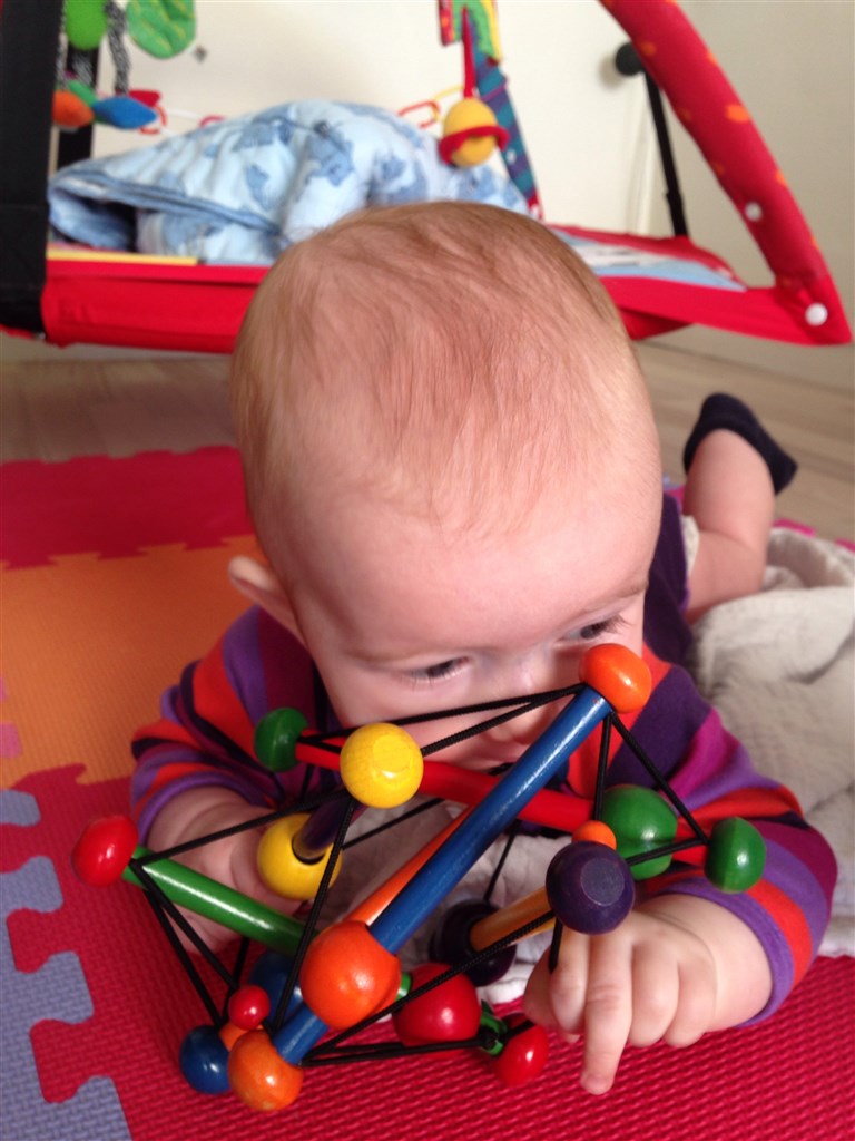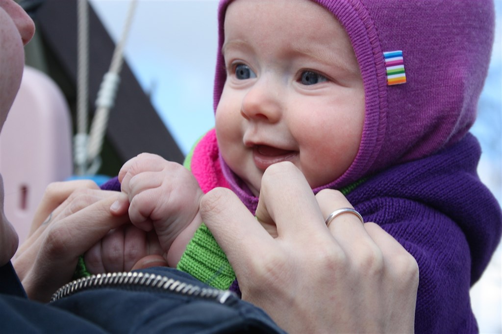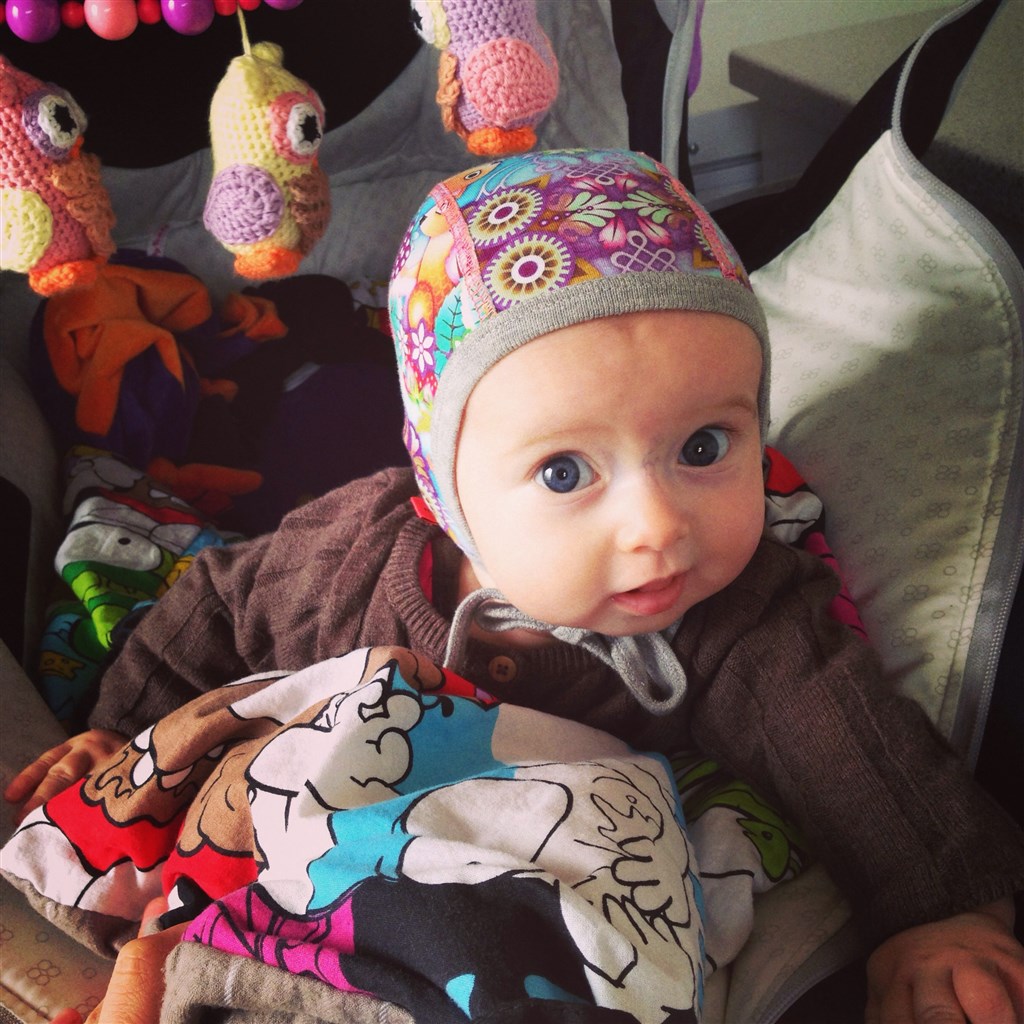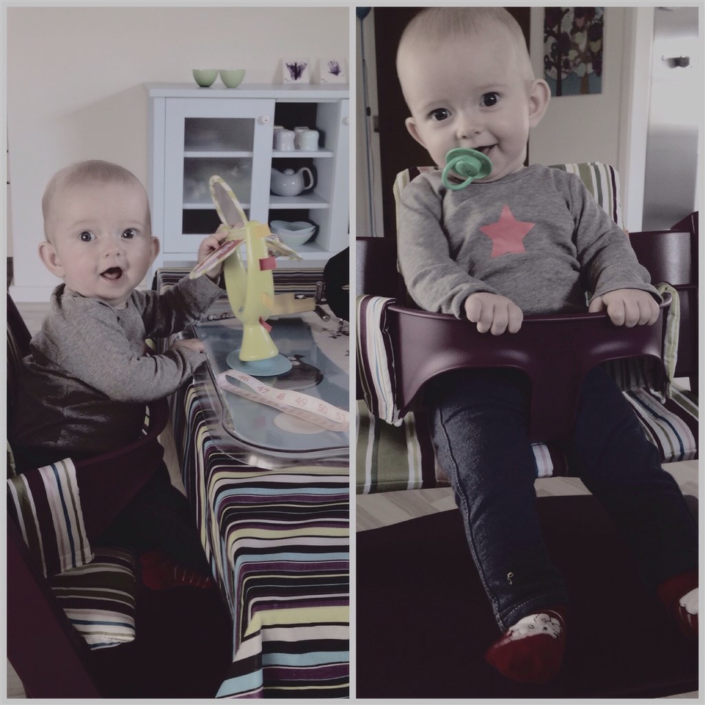 Alt går godt med hende. Vi startede på grød/mos en uge inden hun blev 5 måneder, og hun elsker alt mad. Hun er en dejlig smilende og lattermild pige. Humøret er næsten altid i top. Hun ruller rundt, både fra mave til ryg og ryg til mave. Hun sidder rimelig stabilt og kan selv sidde i sin højstol. Søvn er dog lidt en by i Rusland for hende, men hun er glad langt størstedelen af tiden, så det er ok