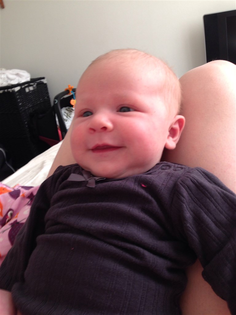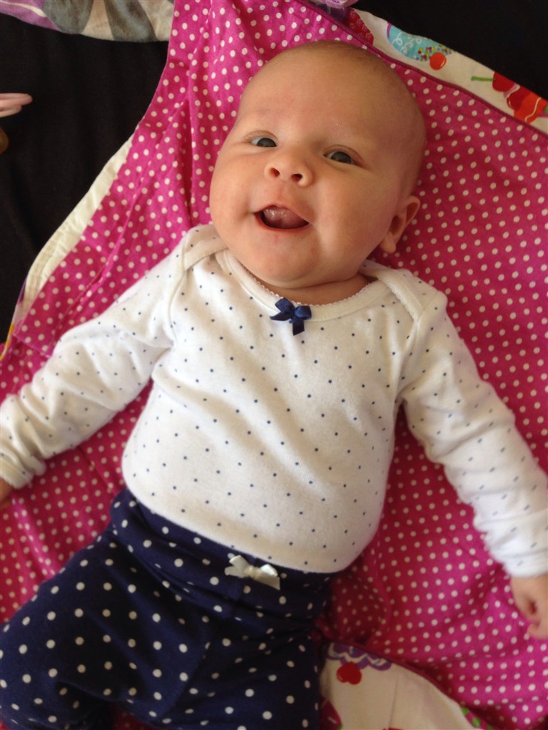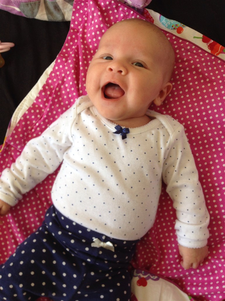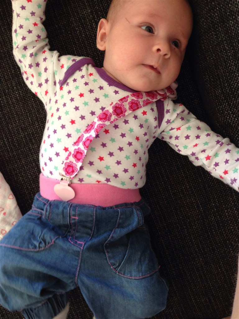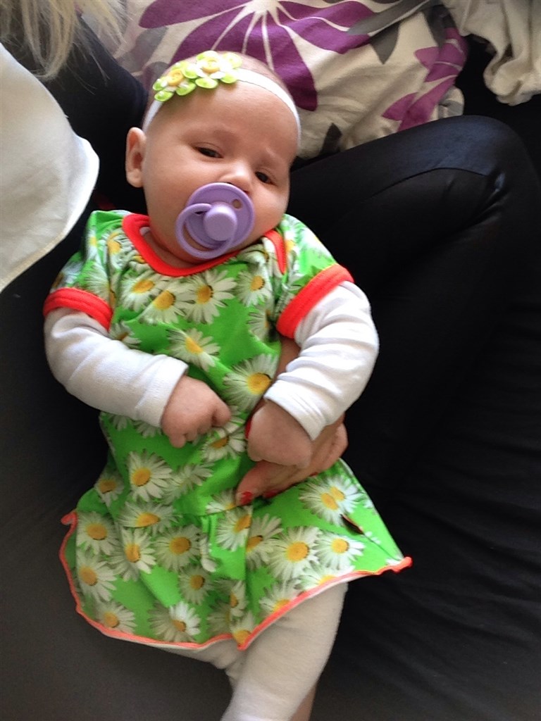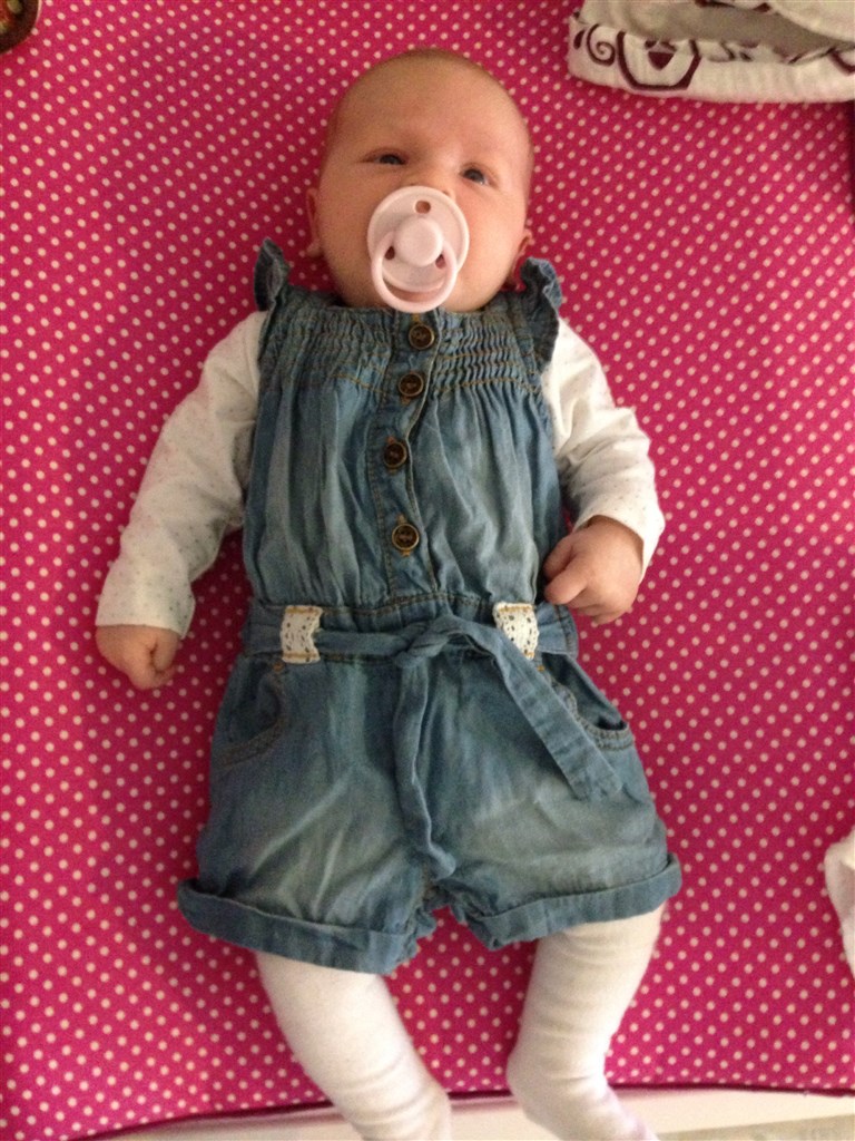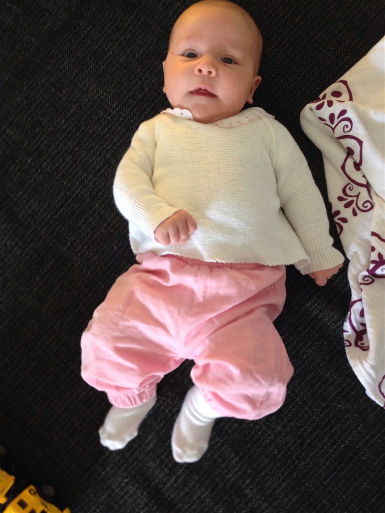 Trives rigtig fint. Er en meget glad og nem lille pige. Storebror Jamie er elle vild med hende og kan ikk få nok af og kramme hende. Så dejligt med søskende kærlighed.