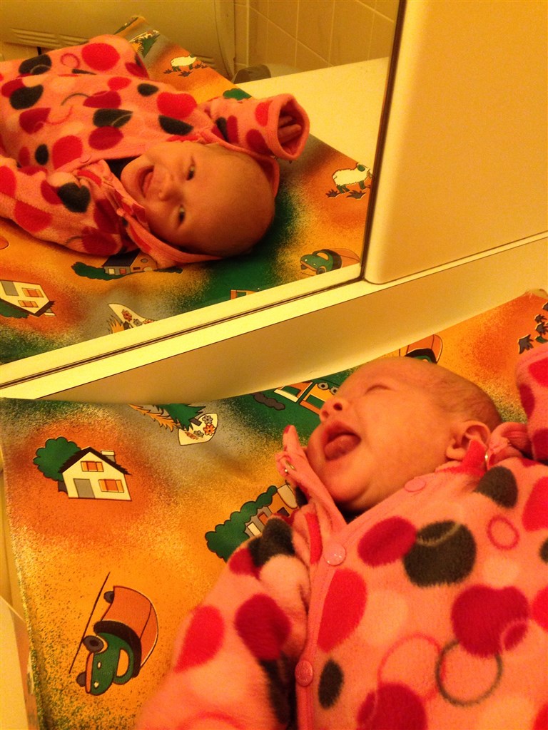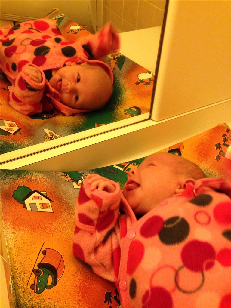 Hun har lige her til morgen opdaget sine hænder. Hihi