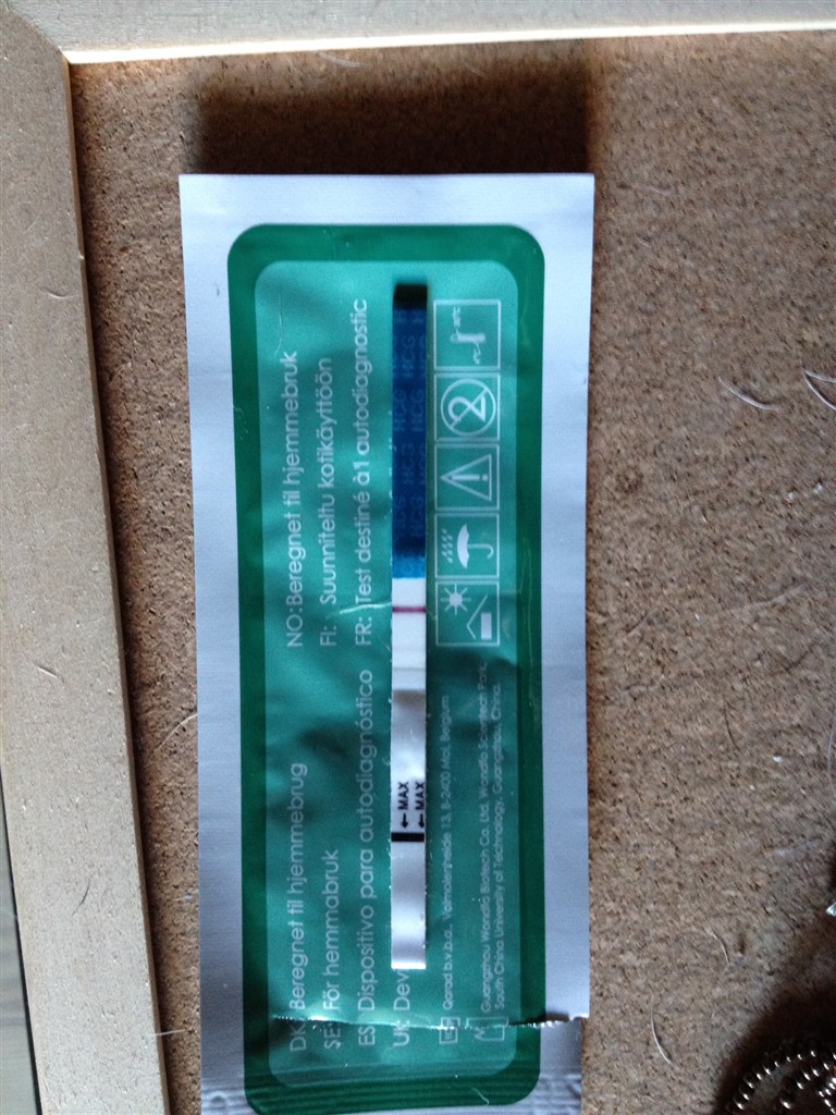 Negativ test her til morgen. Men jeg var doven, og tog ikke tid på den, så tiden var på slump. Lige da jeg skulle pakke den sammen, syntes jeg alligevel jeg kunne ane noget, men det var så lidt, at det kunne være synsbedrag. Så jeg lagde den væk, for at se om "noget" blev til mere.