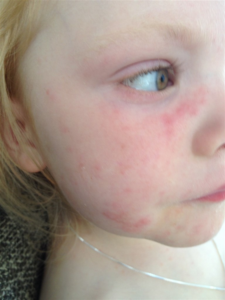 I dag, da jeg henter hende i børnehave har hun feber (omkring 39) og hun har udslæt i ansigtet, på mave, ryg og ned ad lårene. Det klør ikke, men hun er mærket af feberen.