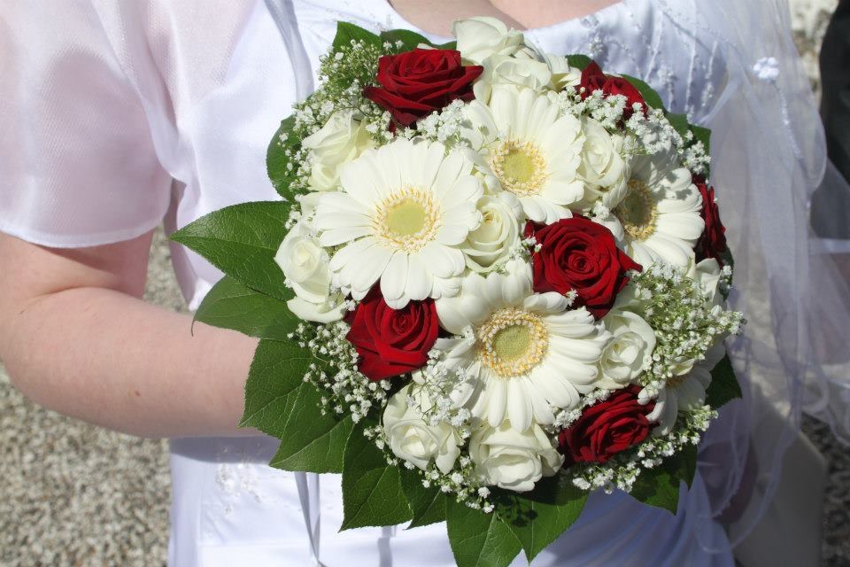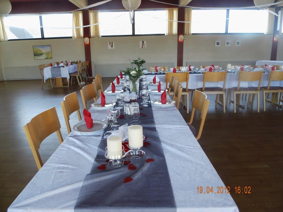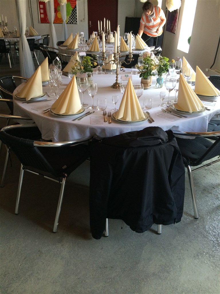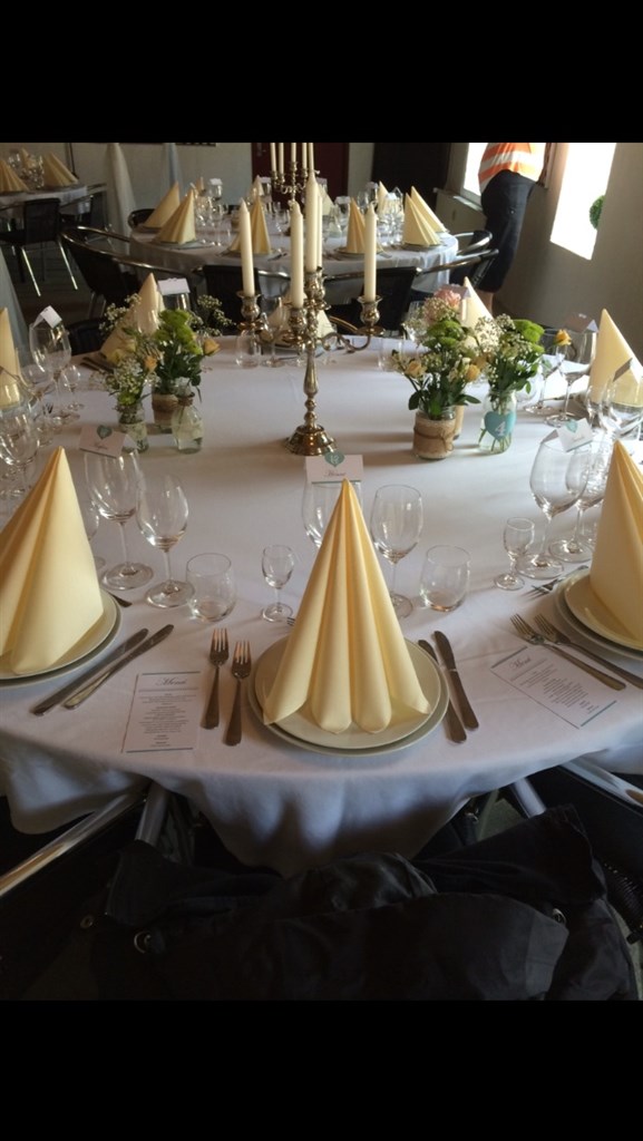 rigtig flot buket! Og fin bordpynt kan godt lide den måde servietterne er foldet på. Det ser ud til at være holdt ude? Så har i måske også fået lidt hjælp til pynten. Vi holder det hjemme.