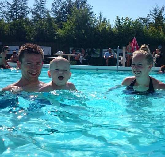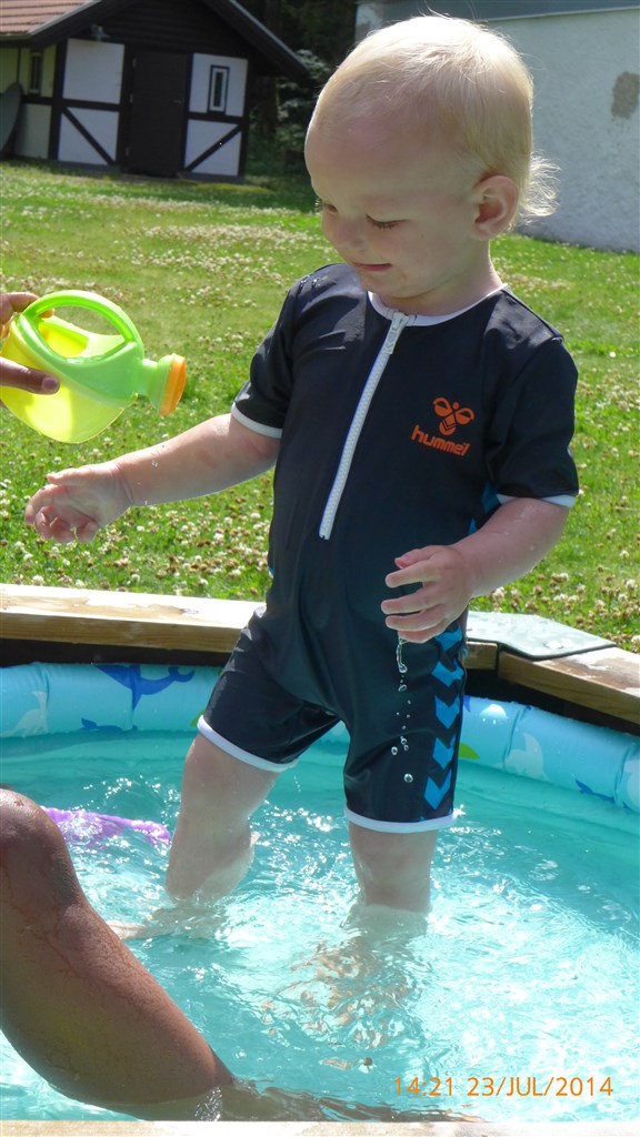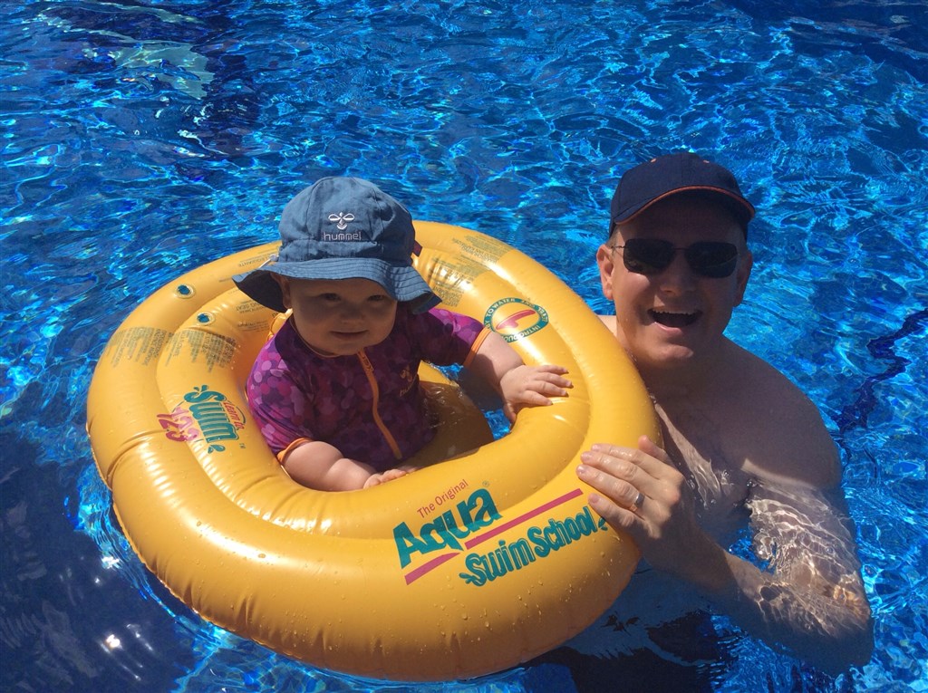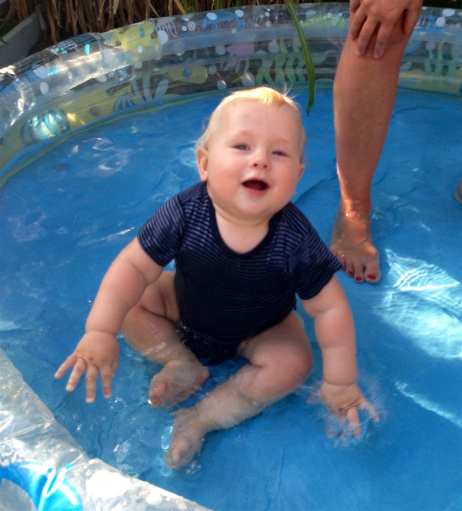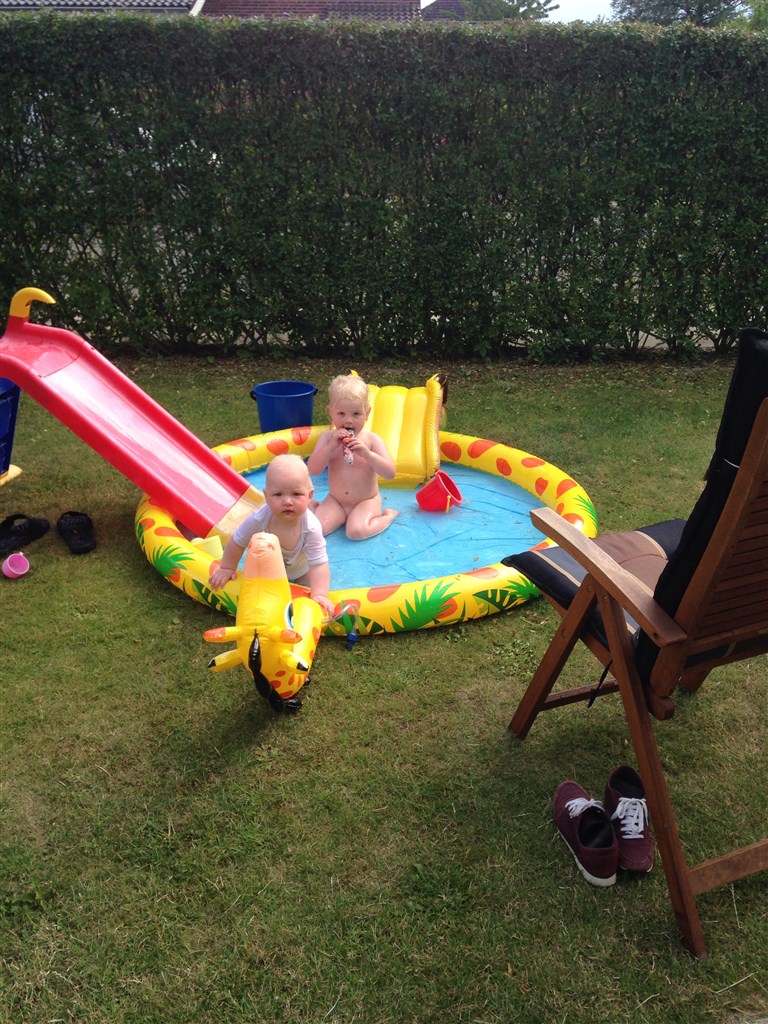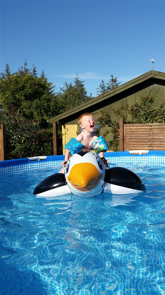 Farmor har pool og den er hun helt vild med, og faster har også pool, men vi bader i det store fællesbassin, hvor Marie kan drøne rundt i sin badering, da hun kan nå bunden.
