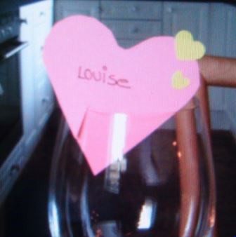 Så jeg har bare taget en hjerteformet kageudstikker, tegnet et hjerte med den i den farve som farvetemaet er og så efterfølgende klippet det ud, brugt mine små udstikkere og udstukket to mindre hjerter, sat i højre hjørne øverst, og så i vestre side lidt ved siden af spidsen, klippet et lille stykke (bare et klip) så den lige kan sidde på glasset. Og så skrevet navnet i midten med sort pen. Super enkelt.