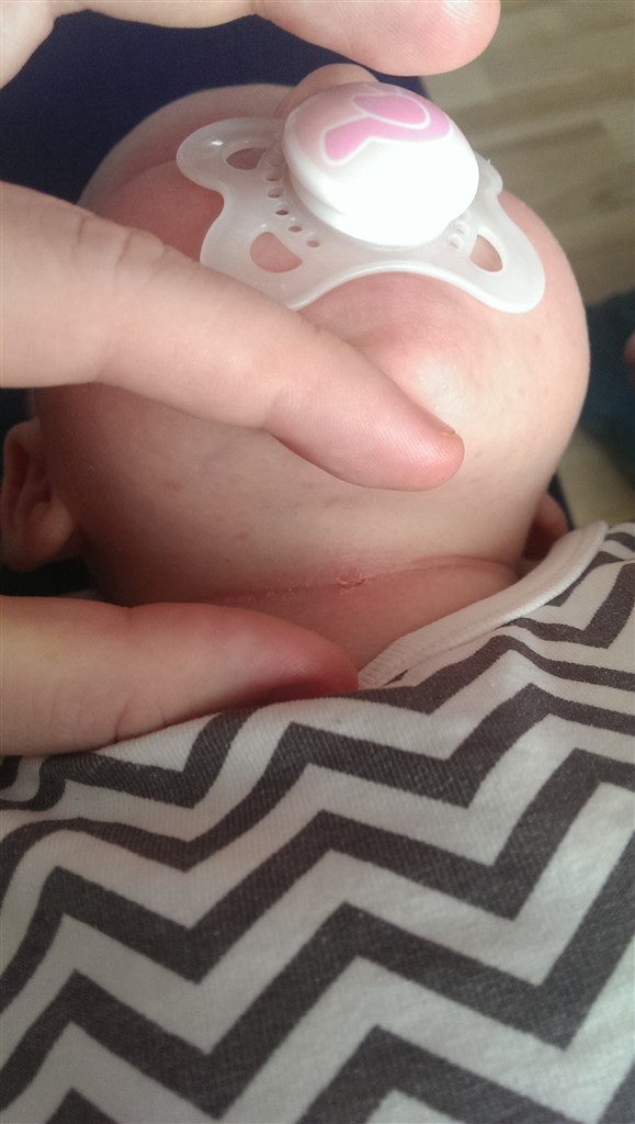 Aisha skriver: Måske skulle du Amme hende med en savlesmæk ? Og rengør det med vand og komme en god fed Krem på. Min søn har sensitiv hud og der skal heller ikke meget til. Det skal bare holdes tørt og evt noget Krem på.