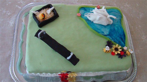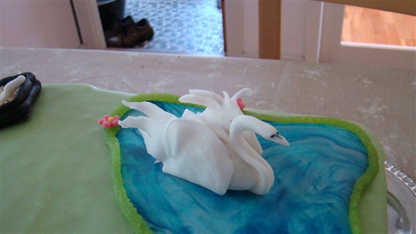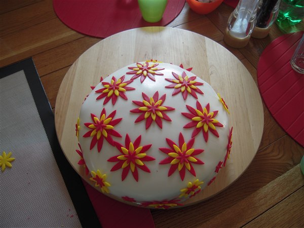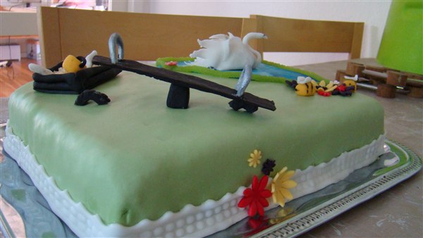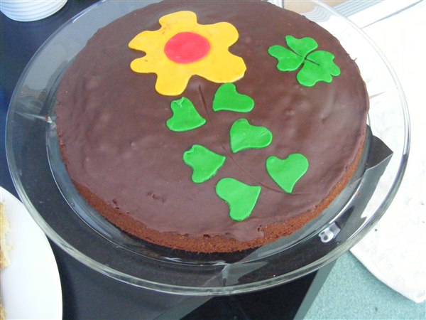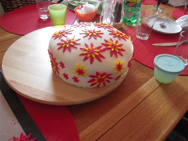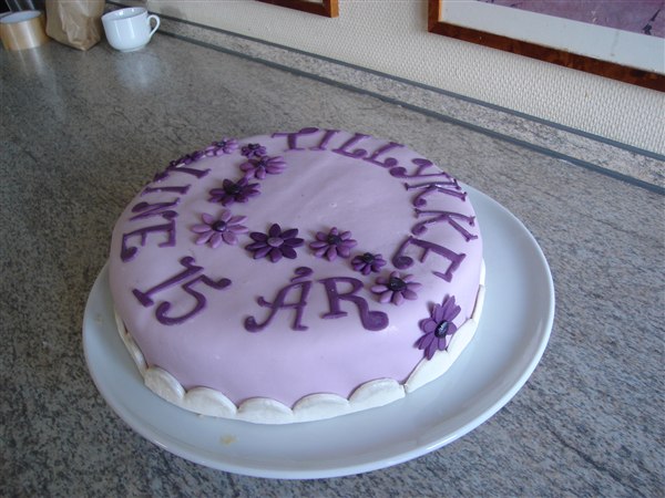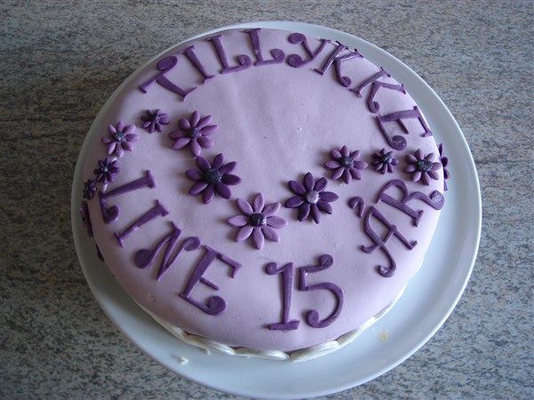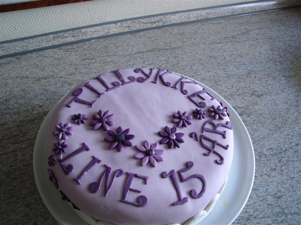 Fyld: 1 lag jordbærmousse, 1 lag m. hakket daim+flødeskum og 1 lag med blandede bær mousse (brombær, blåbær, ribs osv). Imellem lagene købe-lagkagebunde.