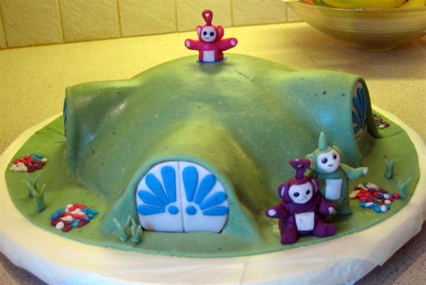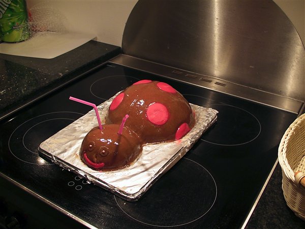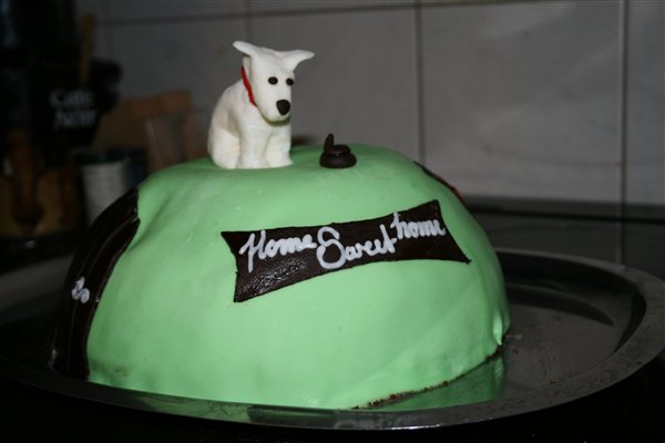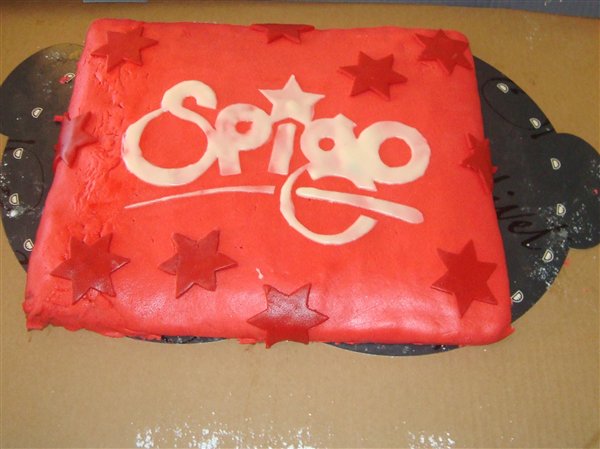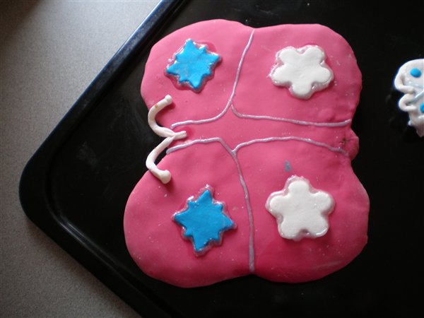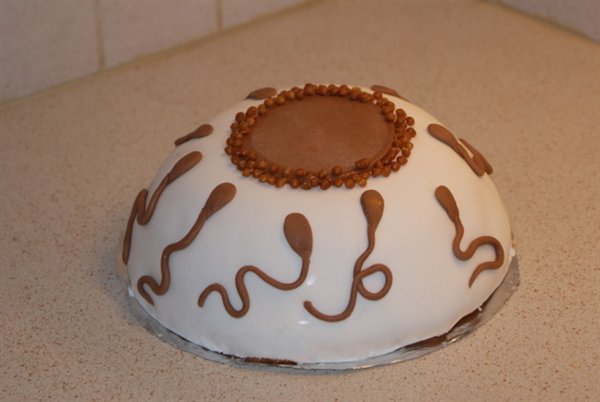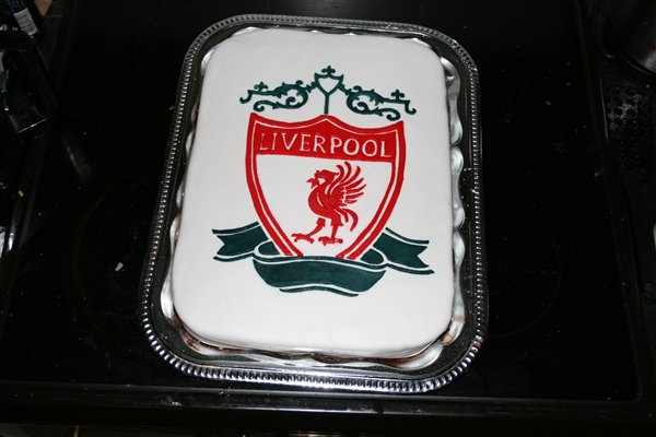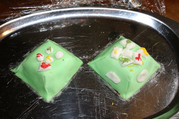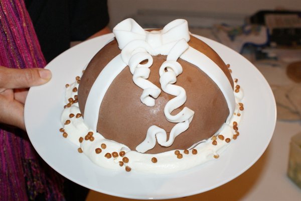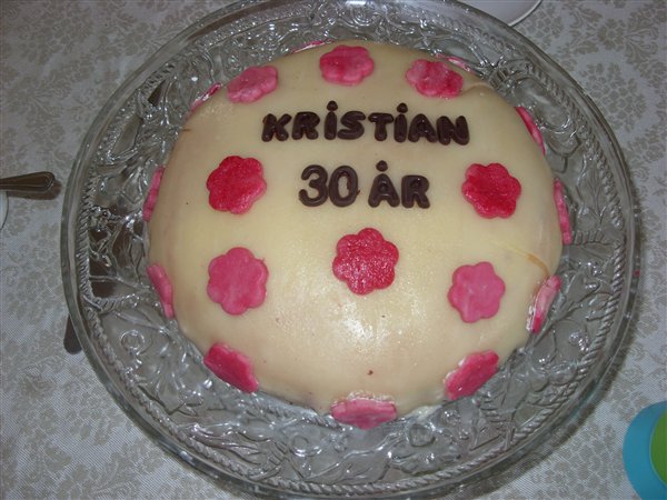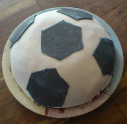 3. fodbold: shokoladekagebunde, 1 lag Marabu creme, 1 lag hindbærmouse, overtrukket med hvid sugarpaste og pyntet med farvet sugarpaste felter.
