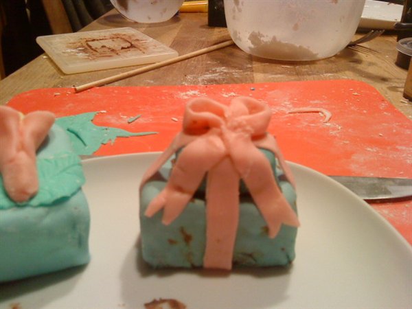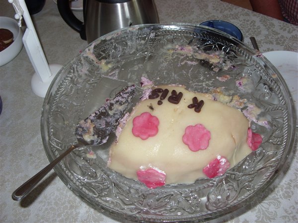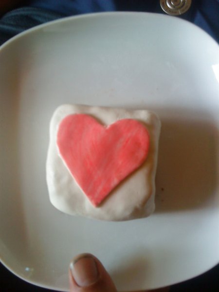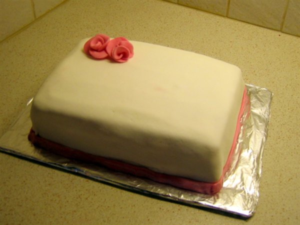 2. Marimekko kage: shokoladekage bunde, 1 lag toblerone creme, 1 lag jordbærmouse overtrukket med hvid sugarpaste og pyntet med farvet sugarpaste blomster