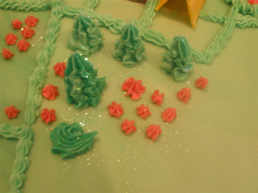 bare en alm chokolade kage. med pynt.. træer og buske er i smør crem