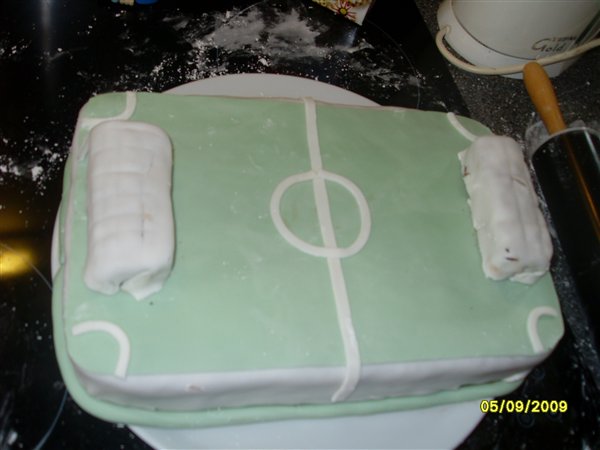 Fodboldbanen er en alm chokoladekage smurt op med kakaosmør og overtrukket med MMF, havde desværre pludselig en skrigende unge så mål mm, blev ikke så godt...