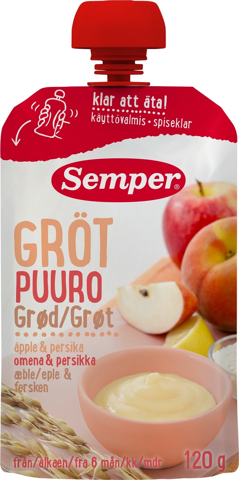Du kan vælge mellem 3 forskellige pouch: Grød med frugt, grød med æble og fersken og grød med pære og abrikos. De 3 grødvarianter er alle med frugt, som giver en naturlig sød smag, som børnene elsker. Grøden består af havre, frugt og rapsolie og indeholder ikke konserveringsmidler eller farvestoffer. Grøden kan spises opvarmet, men man kan også spise den kold og direkte fra emballagen. Det gør den spiseklar grød til en kær ven, når man er farten.