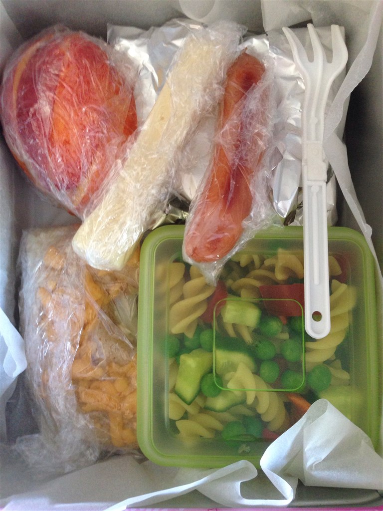 de har hver fået en potion pastasalat (gulerødder, salat, agurk, peberfrugt og pastaskruer) med stegte pølser stykker i.