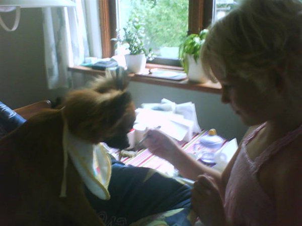 Clara har både bøvset ham, pruttet ham på maven, kørt ham i dukkevognen og båret ham på ryggen. Og sidst men ikke mindst gav hun ham ble på. hmmm ski da en mærkelig hund der gider finde sig i det