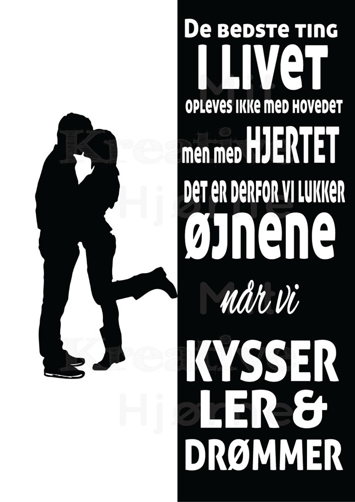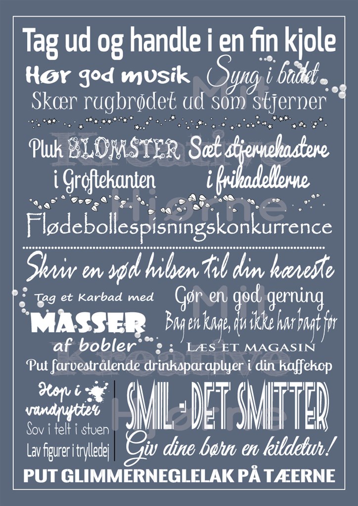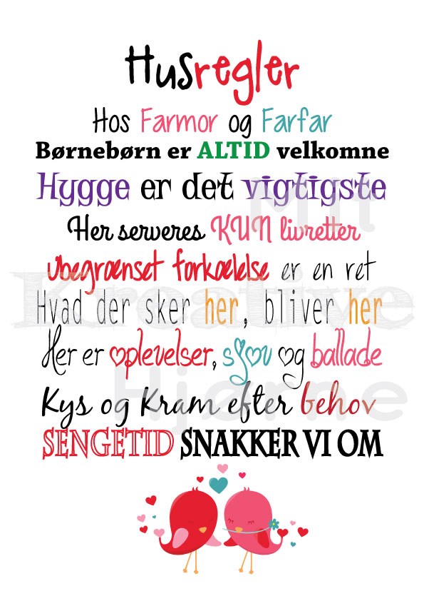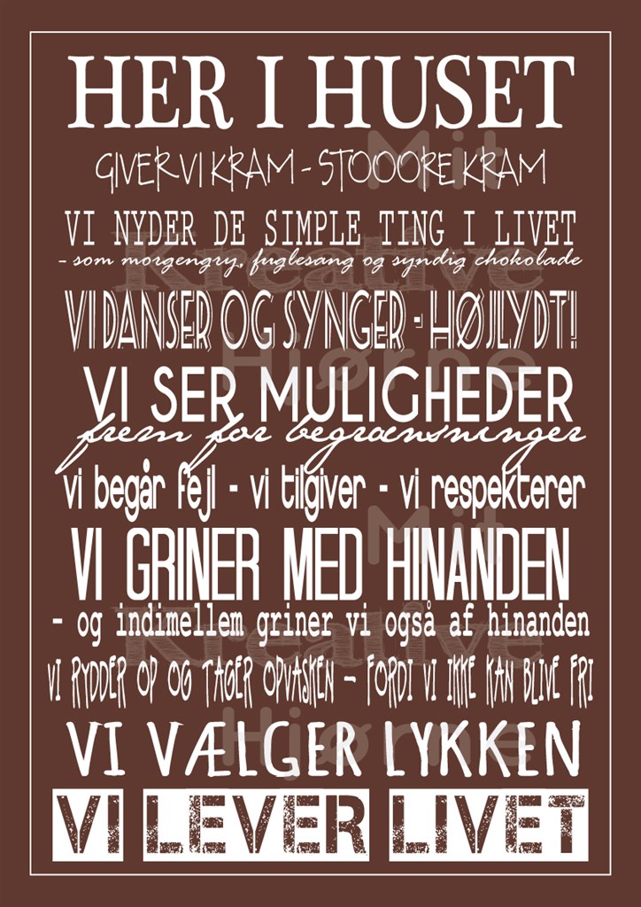 Se desuden mine andre plakater, fx "De bedste ting i livet" "Glimmermandag", "Her i Huset" og "Mest af alt holder jeg af hverdagen" eller en af mine børne plakater. De fleste findes i flere farver, se hjemmesiden for detaljer, eller spørg efter en specifik farve. Jeg laver også bestillingsarbejde til rimelige priser - spørg efter tilbud.