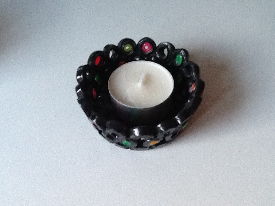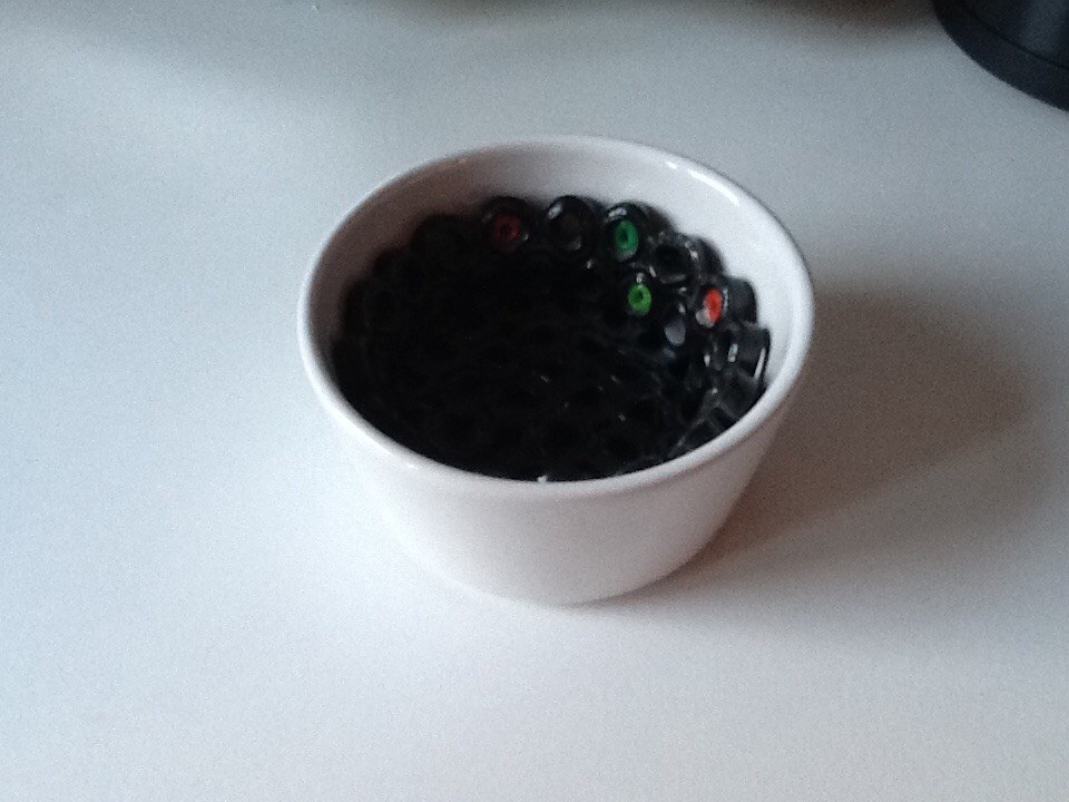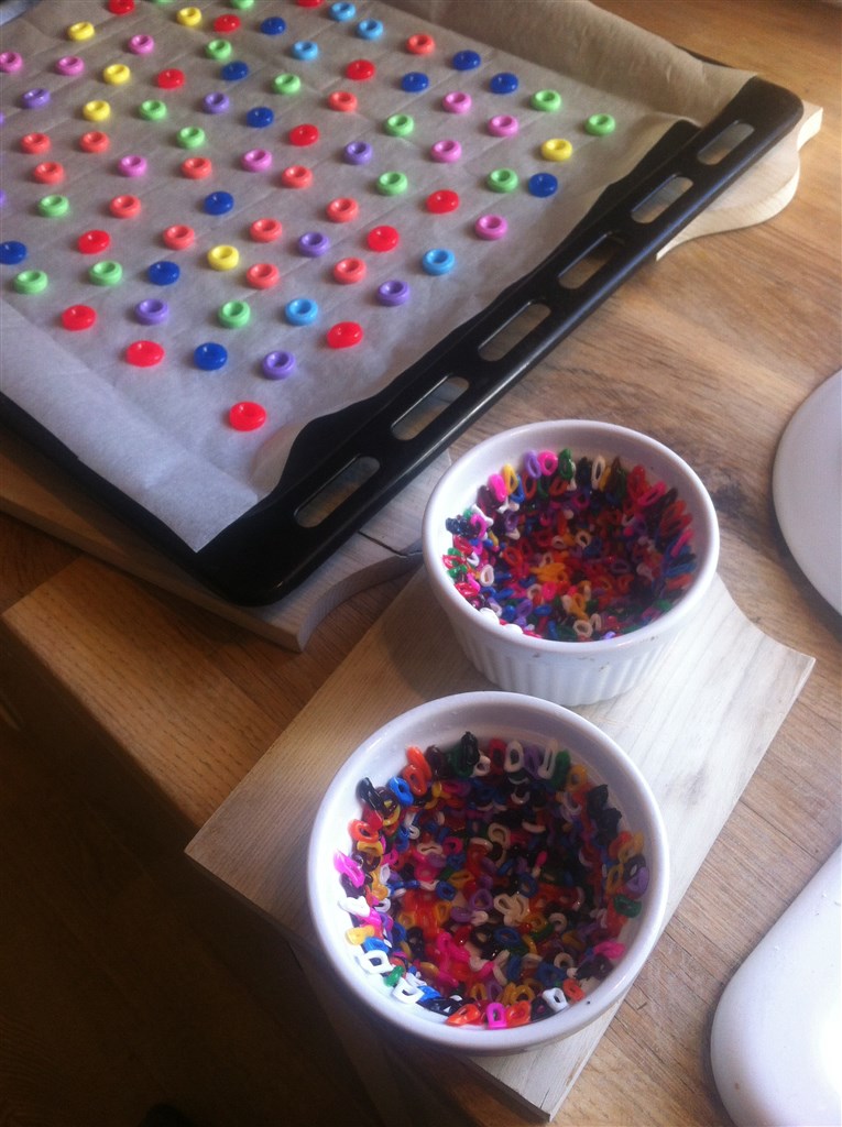 Og et billede i baggrunden af de store perler som skal blive til armbånd.