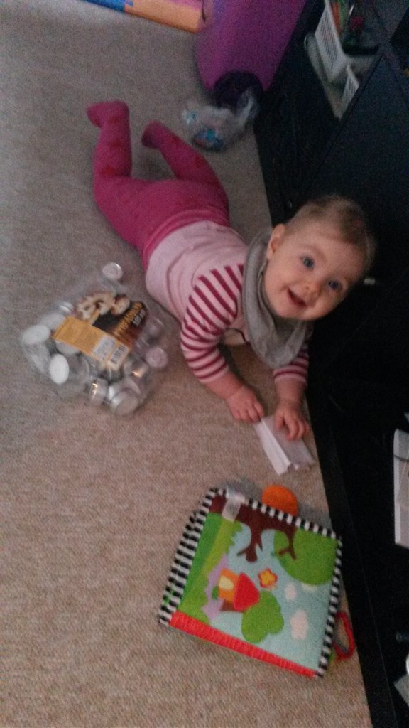 Min datter der på en eller anden måde fik fat i tingende i vores skænk selv om hun ikke kravler endnu lykkes det alligevel