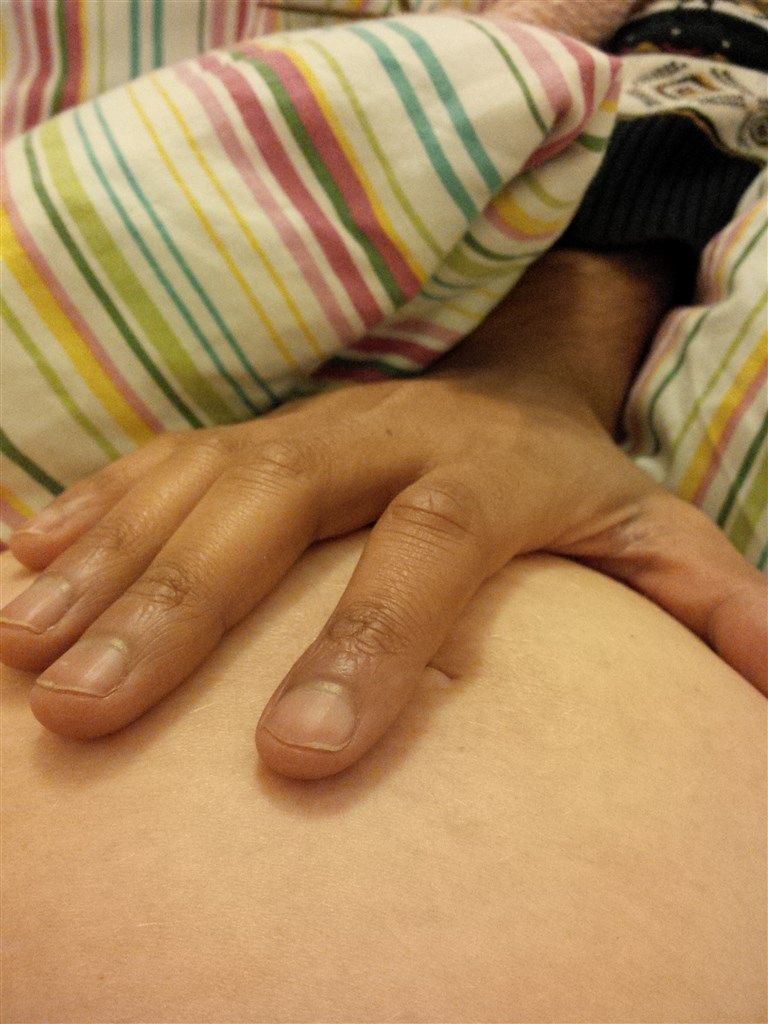 Her er mit nr 12. Det er fra forleden, hvor jeg havde tilbragt hele dagen i sengen og min kæreste kom hjem og hilste på mig og baby.