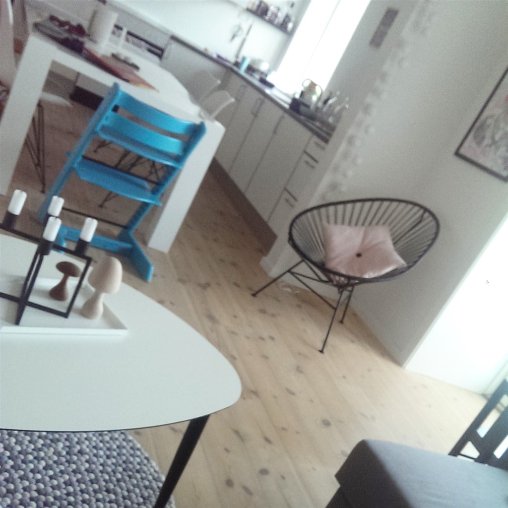 Krussedulle skriver: Vi har. Stue og køkken i et. (Beklager rod på spisebordet )