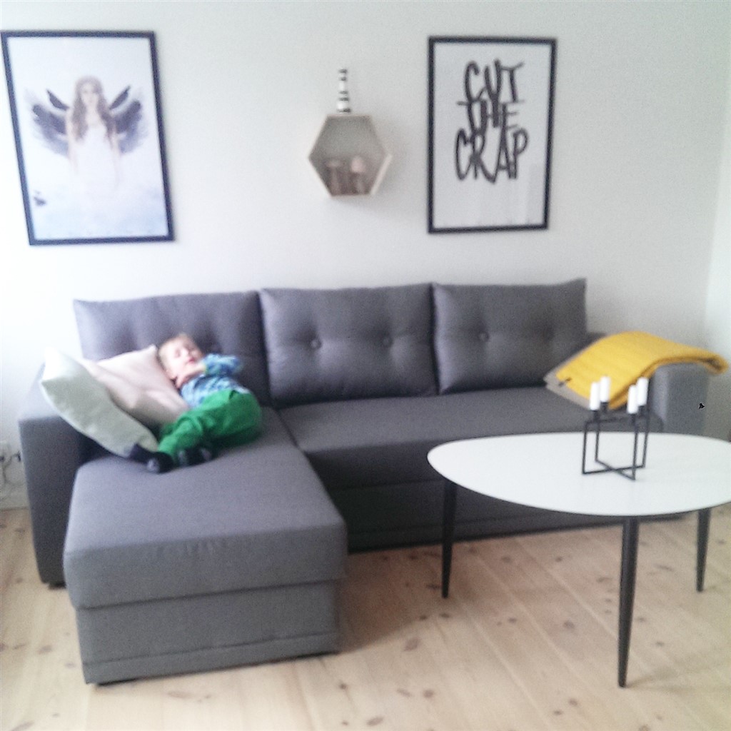 Vores stue er virkelig ikke stor. Vi bor i en lejlighed med 2 stuer med dør i mellem og den mindste stue (spisestuen) bruger vi så som børneværelse, så vi skal have både sofa og spiseplads i den ene stue kun. Vi har en 3pers sofa med chaiselong, et lille sofabord, tv bord med fjernsyn, og et spisebord med 4stole. Det er alt hvad vi har af møbler i stuen, og der er ikke særlig meget gulvplads. Men det går an