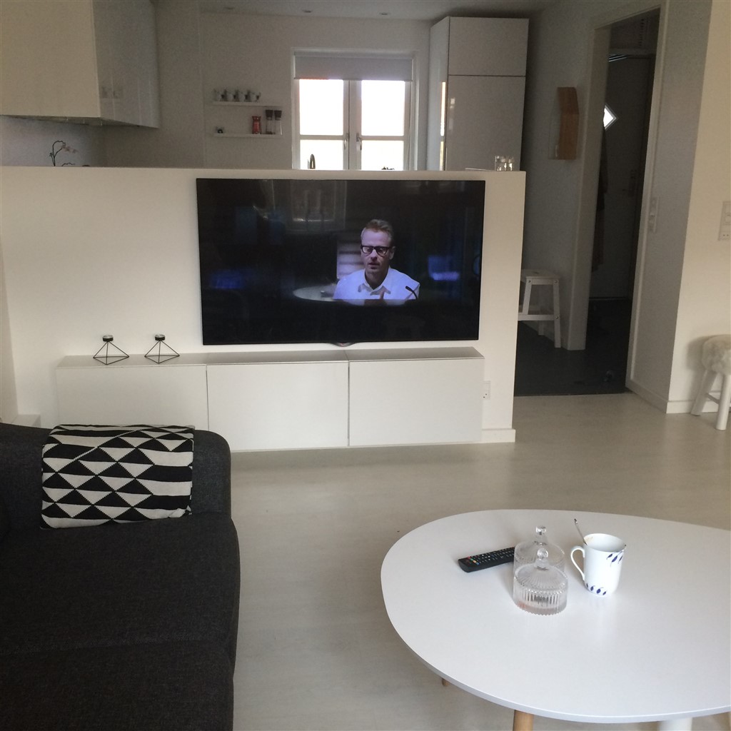 Mor11 skriver: Vores stue er virkelig ikke stor. Vi bor i en lejlighed med 2 stuer med dør i mellem og den mindste stue (spisestuen) bruger vi så som børneværelse, så vi skal have både sofa og spiseplads i den ene stue kun. Vi har en 3pers sofa med chaiselong, et lille sofabord, tv bord med fjernsyn, og et spisebord med 4stole. Det er alt hvad vi har af møbler i stuen, og der er ikke særlig meget gulvplads. Men det går an
