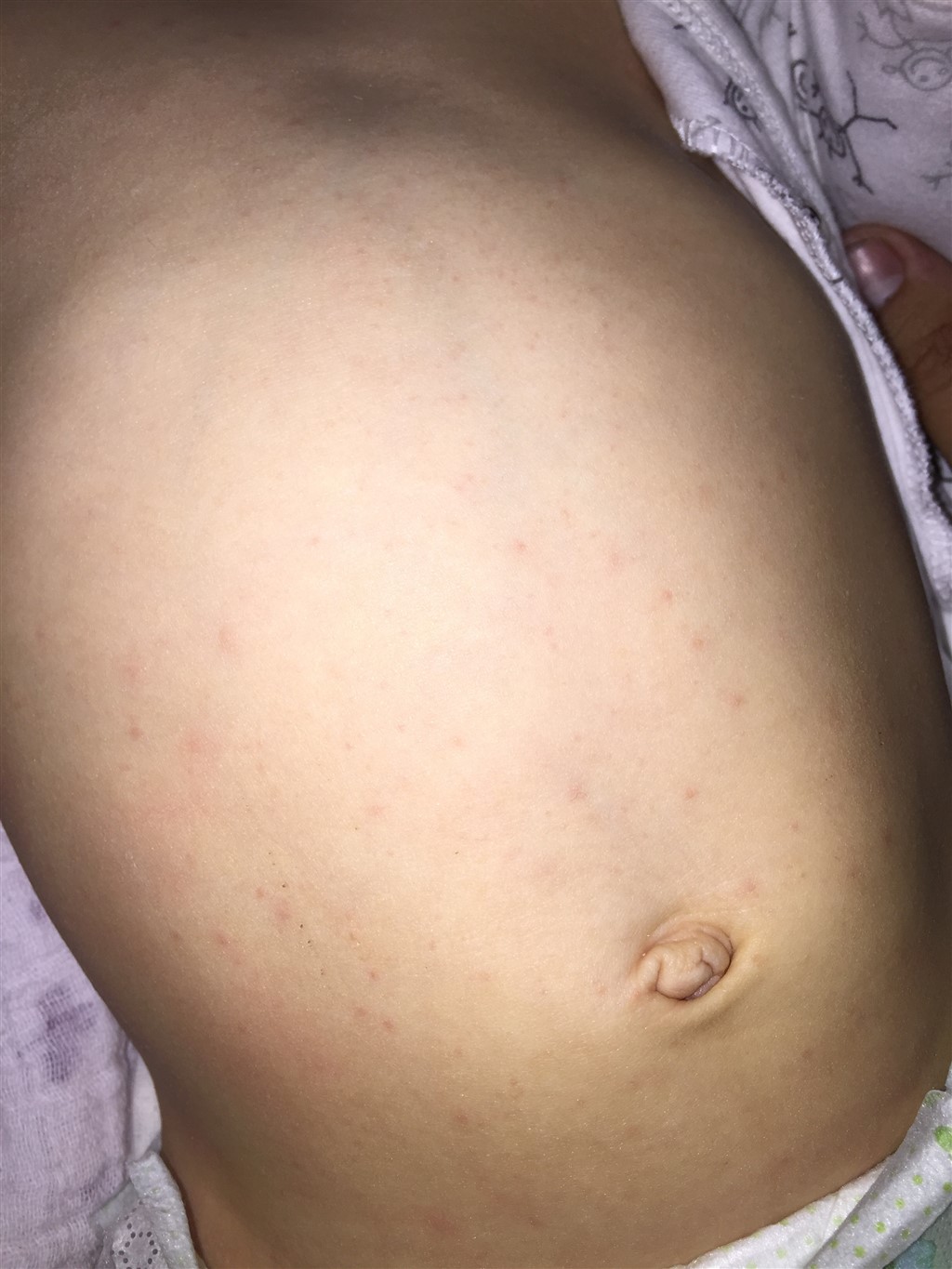 Ingen feber og dejlig frisk men prikker på mave, ryg, baller og lår
