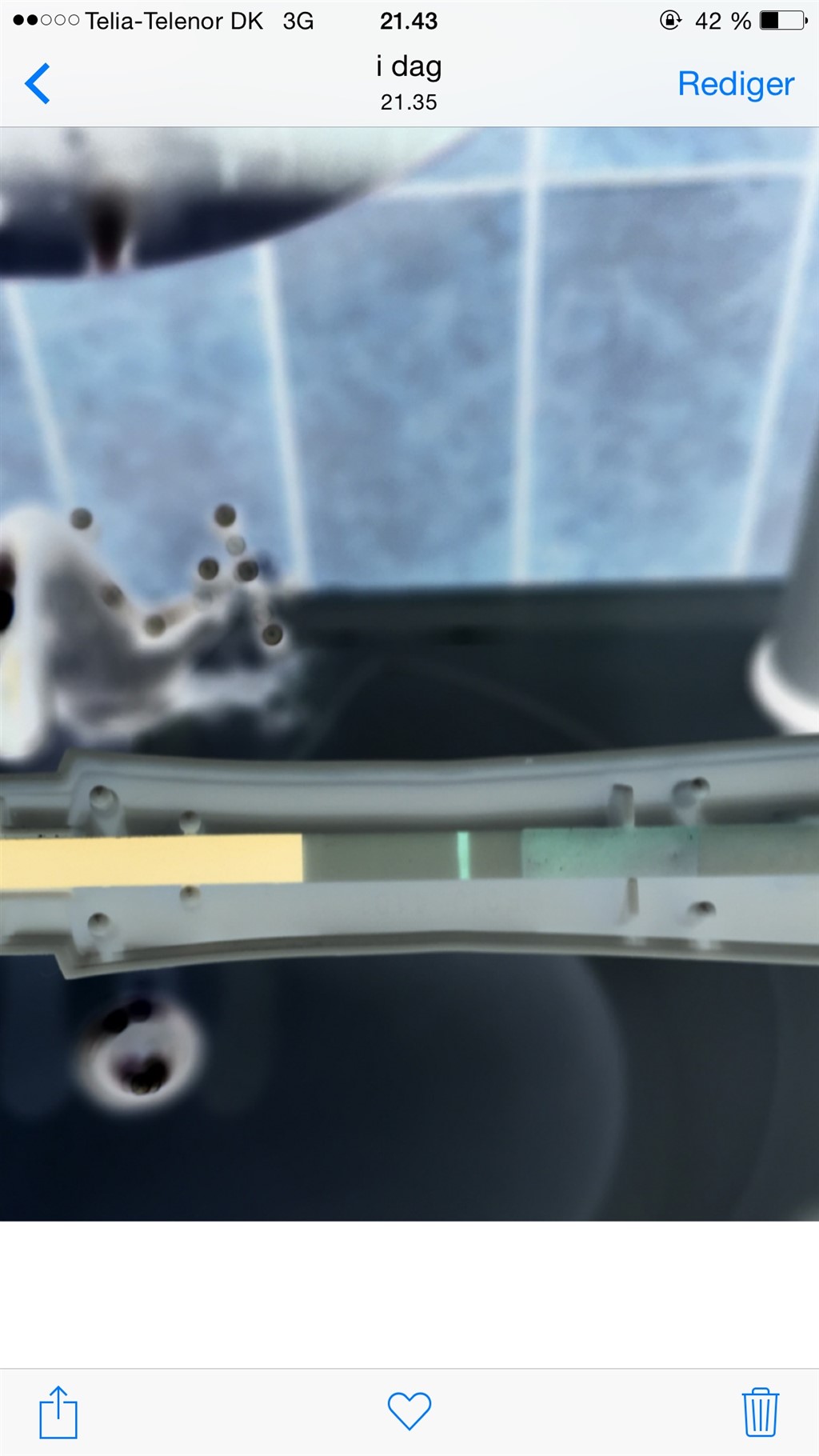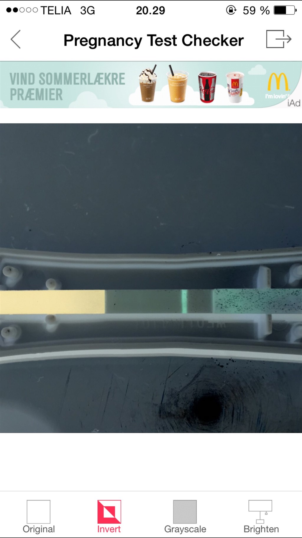 Jeg kan desværre ikke se noget på billederne. Måske en lille bitte streg på det negative billede, men kun hvis jeg virkelig kigger efter. 10 minutter synes jeg lyder lige lovlig lang tid efter, at du har taget testen.
