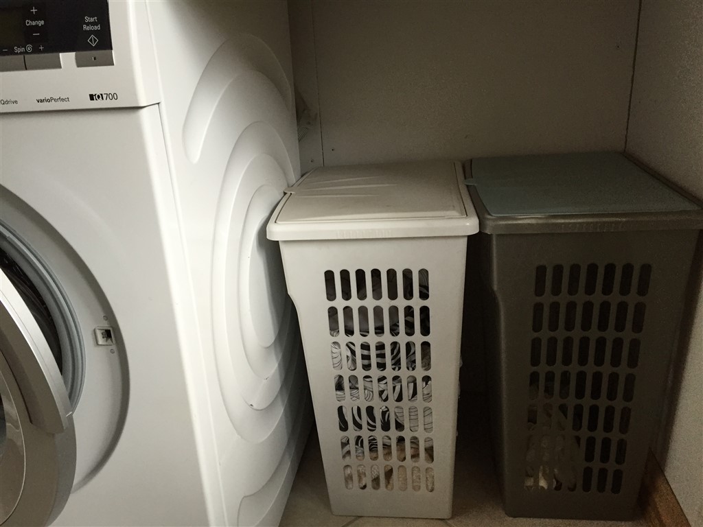 Vi har et meget lille bryggers og bare to kurve, en til mørkt tøj og en til lyst. De står ved siden af vaskemaskinens. Desuden har jeg en lille kurv på badeværelset til uldbodyer og uldundertrøjer da begge små børn går i uld året rundt. Uldet bliver vasket i hånden på badeværelset.