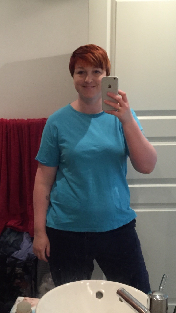 Har du prøvet højtaljede bukser? De er langt mere klædelige for kvinder med lidt mave. Jeg er selv stor fan.