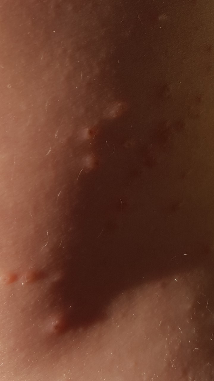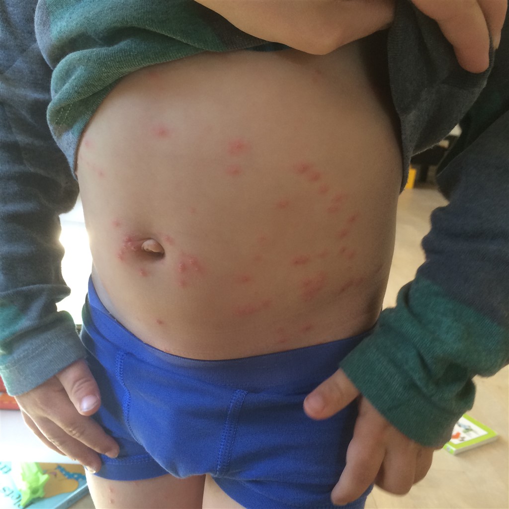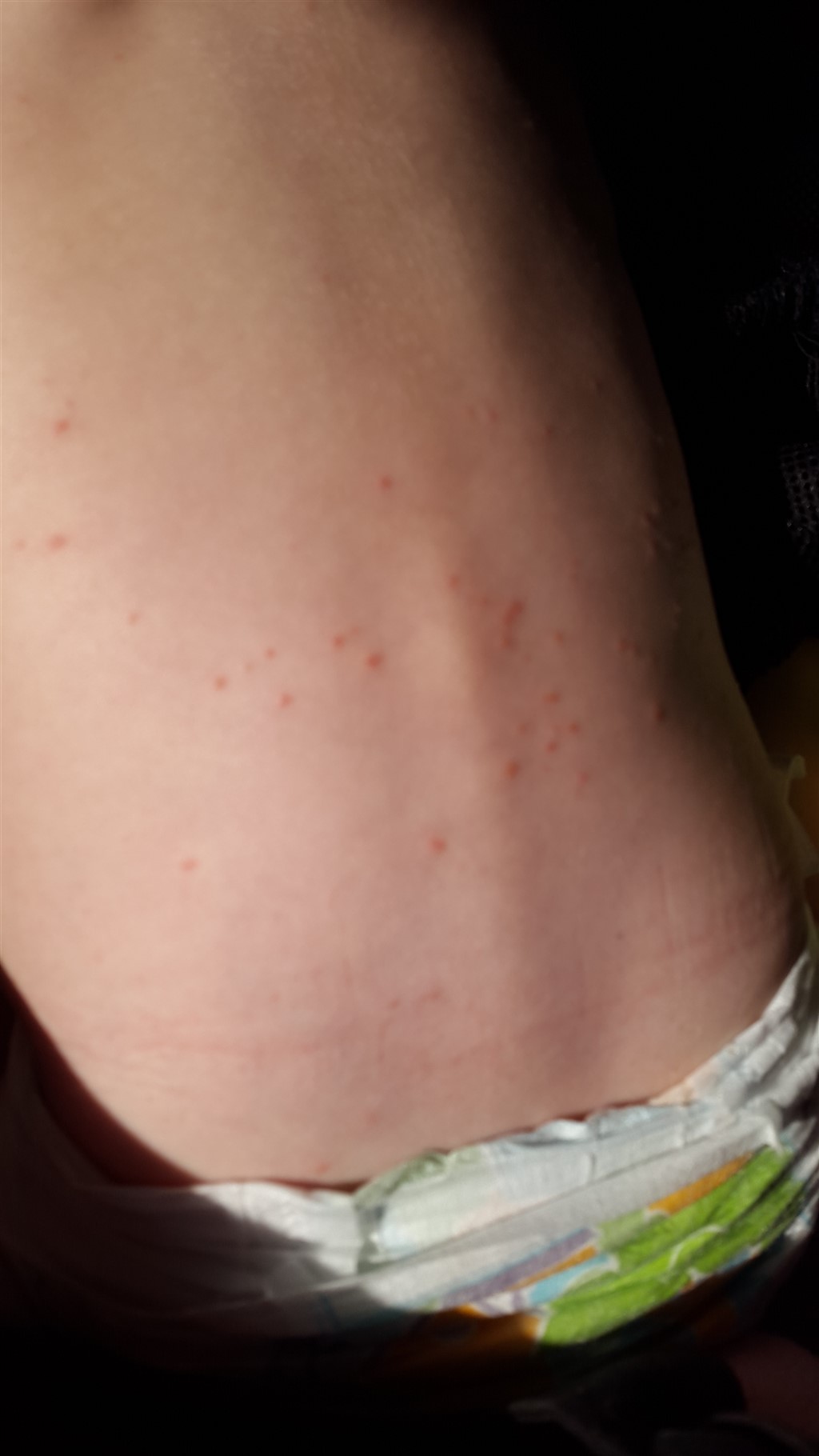 Jeg har en datter på knap et år. Hun har siden tirsdag fået nogen knopper på ryggen. Nu også på arme, numse og hoved. I dag har hun feber. Målt til 40 grader her til aften.