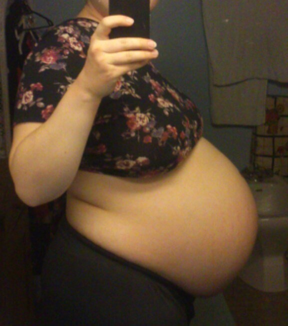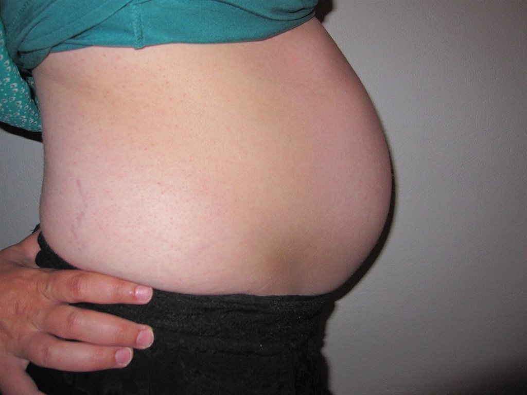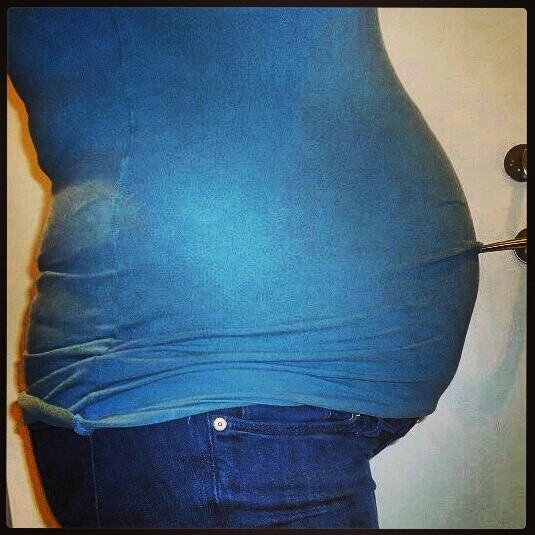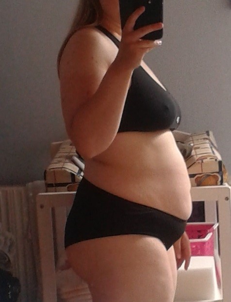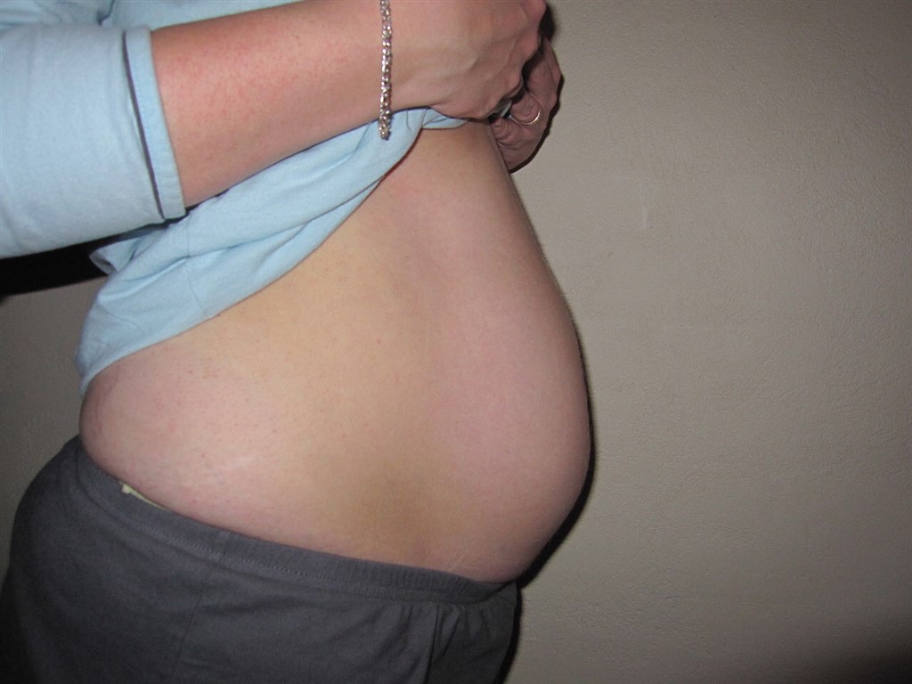 Jeg havde et bmi på 30 da jeg blev gravid første gang, jeg har ikke nogle tidlige billeder fra da jeg var gravid, men jeg så sådan her ud til sidst 38+6 (rød trøje). Det er taget om mandagen, hvor hun er født lørdag morgen (39+5). Jeg nåede ialt at tage 22 kg på