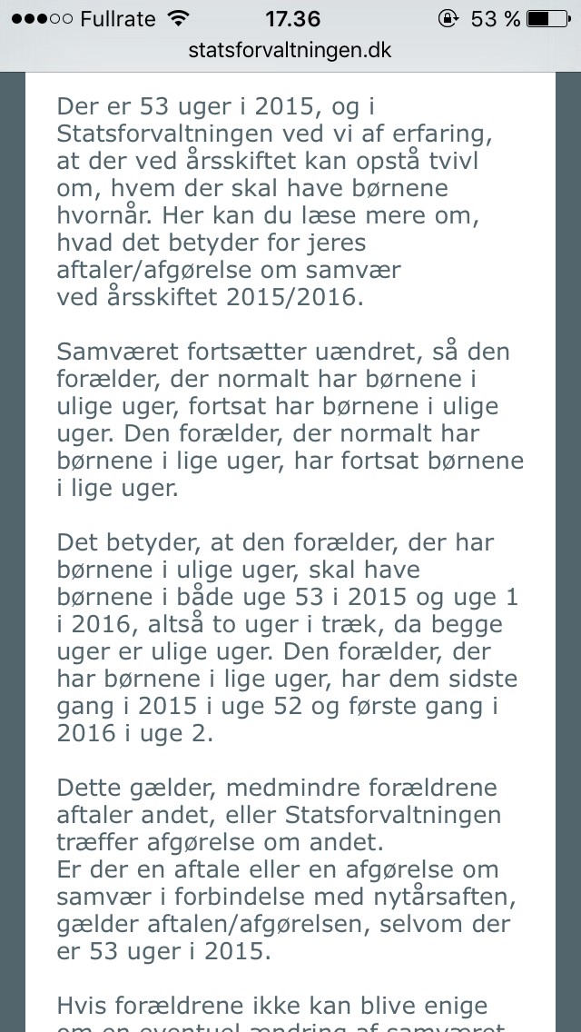 Der er mange der har fået lidt rod i det med ugerne fordi der pludselig var 53 uger sidste år, altså er man gået fra uge 53 til uge 1 = 2 ulige uger i streg, så nogen vælger at fortsætte med hver 2. Uge så man skifter fra lige til ulige eller omvendt, andre har holdt fast i at den der har de ulige uger har haft ungerne 2 uger i streg så vedkommende fortsætter med at have dem de ulige uger efter årsskiftet.