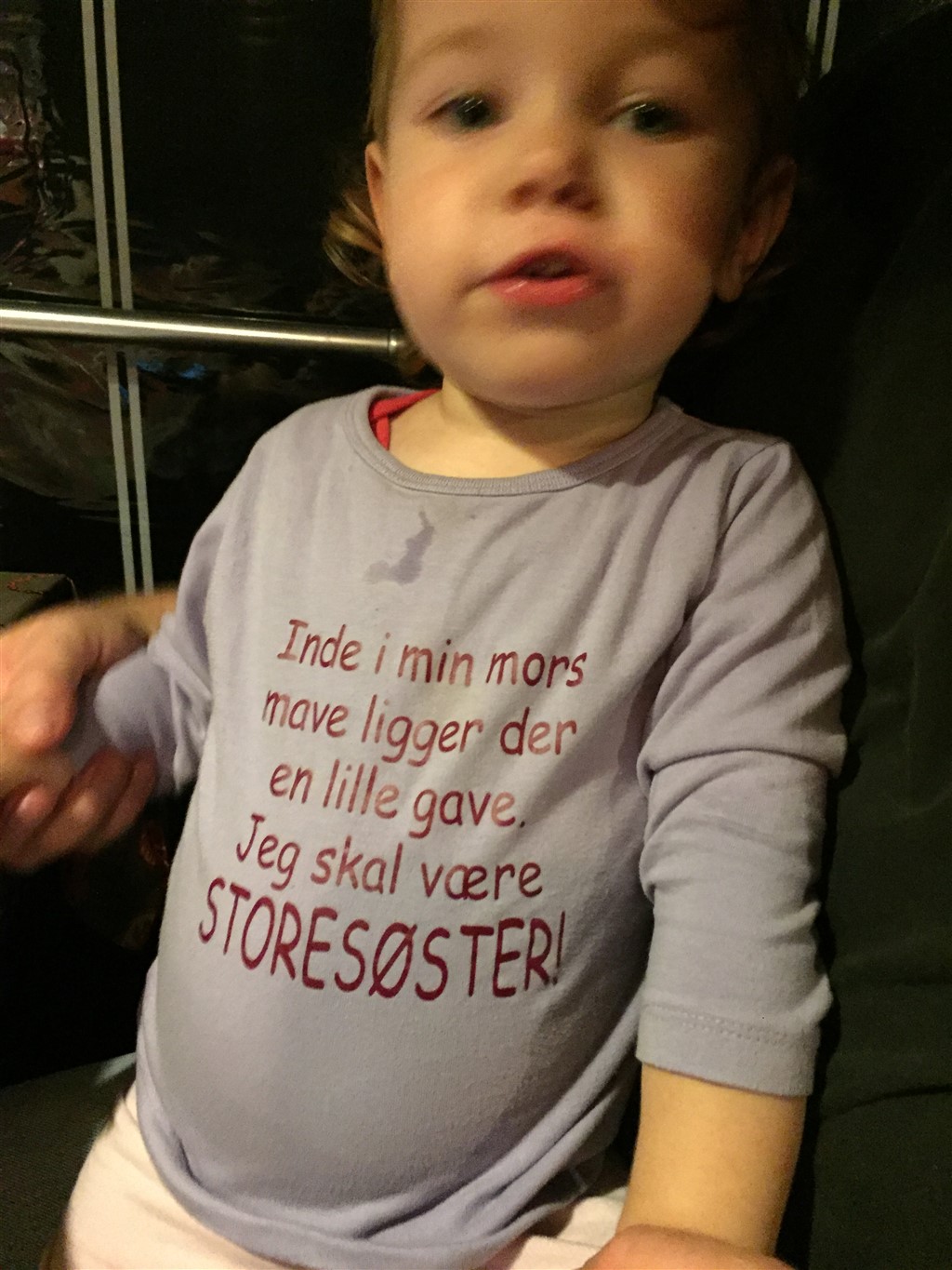 Vi købte "Jeg skal være storesøster bluse" til vores store datter...