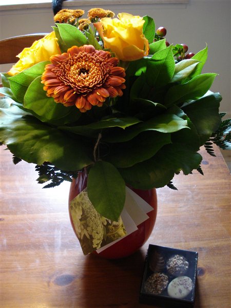 For lidt siden bankede det på døren og udenfor stod en dame med en stor buket blomster til mig. Søren så helt mærkelig ud og sagde, at han ville da godt nok ønske han kunne sige, de var fra ham, men det var de altså ikke, og så måtte jeg pakke op med en ordentlig klump i halsen. Indeni var den dejligste buket i orange farver (som er mine yndlings), en æske chokolade og et fantastisk sødt kort fra Camilla (Majastina). Jeg er bare SÅ glad og SÅ rørt over det, at jeg ikke engang gider forsøge at holde tårerne tilbage