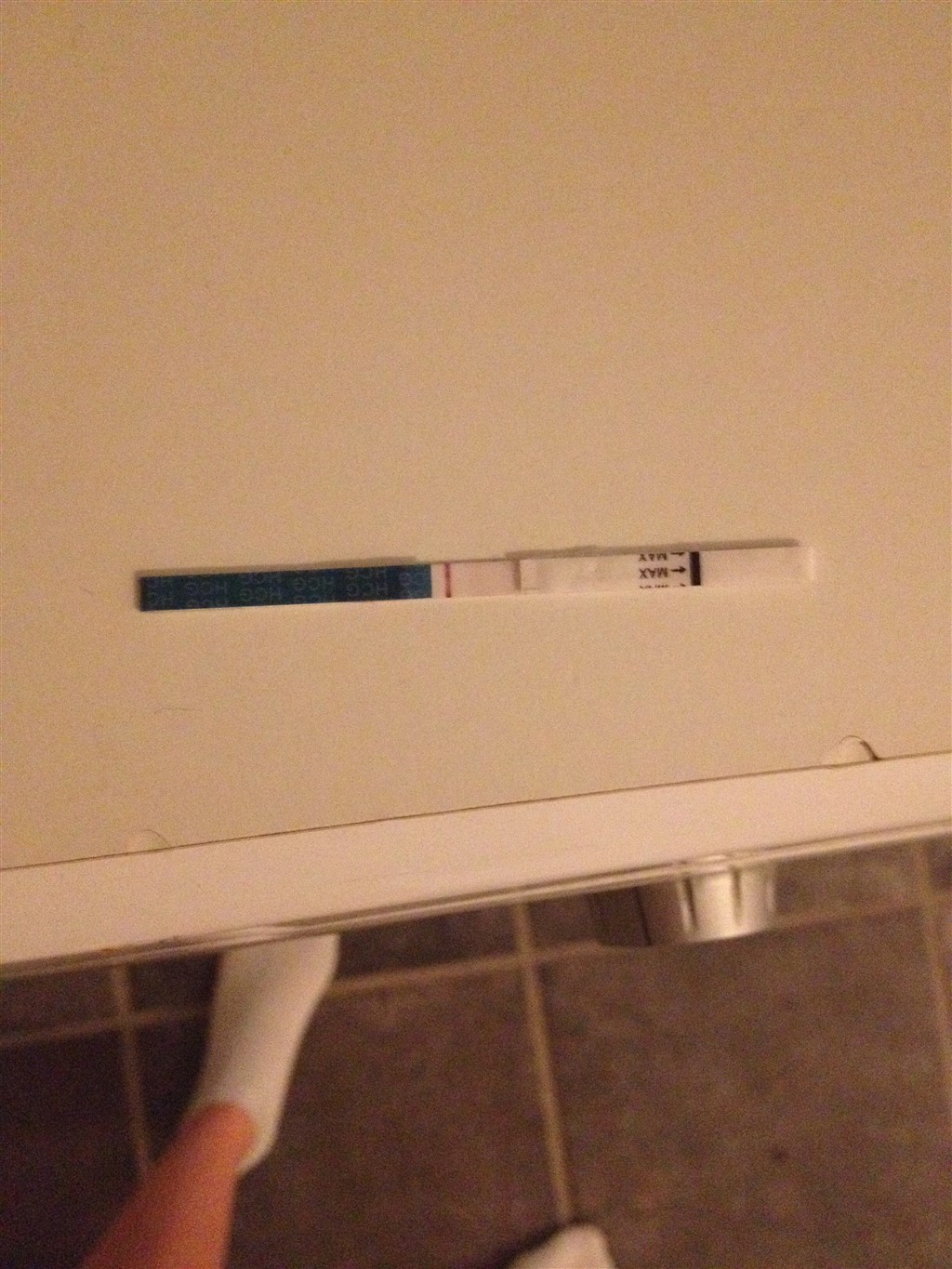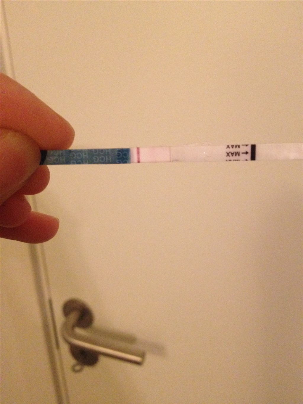 Jeg har lige taget en test (kunne ikke lade være, ligner ellers ikke mig at teste om aftenen og før tid!) - efter ca 5 minutter kom der lidt farve, men i sådan en "fed" og lidt utydelig streg.. Og strippen var gået lidt i stykker i enden, hvor den suger urinen op (det hvide "tape", som sidder fast lidt over "max"), og efter nogle minutter forsvandt farven igen, så tror ikke på den!